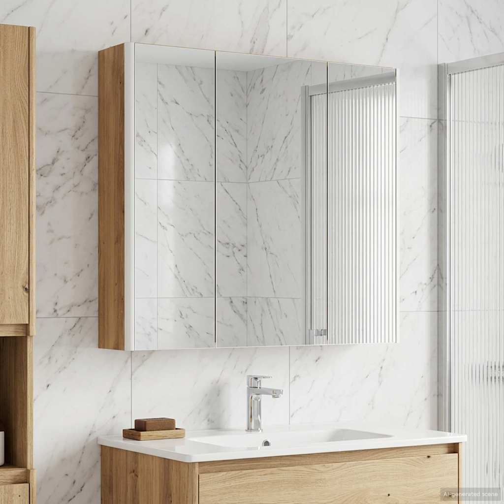 Tämä moderni kylpyhuoneen peilikaappi yhdistää tyylikkään muotoilun ja käytännölliset ominaisuudet, tehden siitä oleellisen lisän nykyaikaiseen kylpyhuoneeseen. Minimalistinen rakenne ja puhtaat linjat tarjoavat hienostuneen ilmeen, mutta kaappi on myös täynnä säilytystilaa päivittäisille tarvikkeille. Valaistus parantaa näkyvyyttä ja tunnelmaa, yhdistäen käytännöllisyyden ja muotoilun.