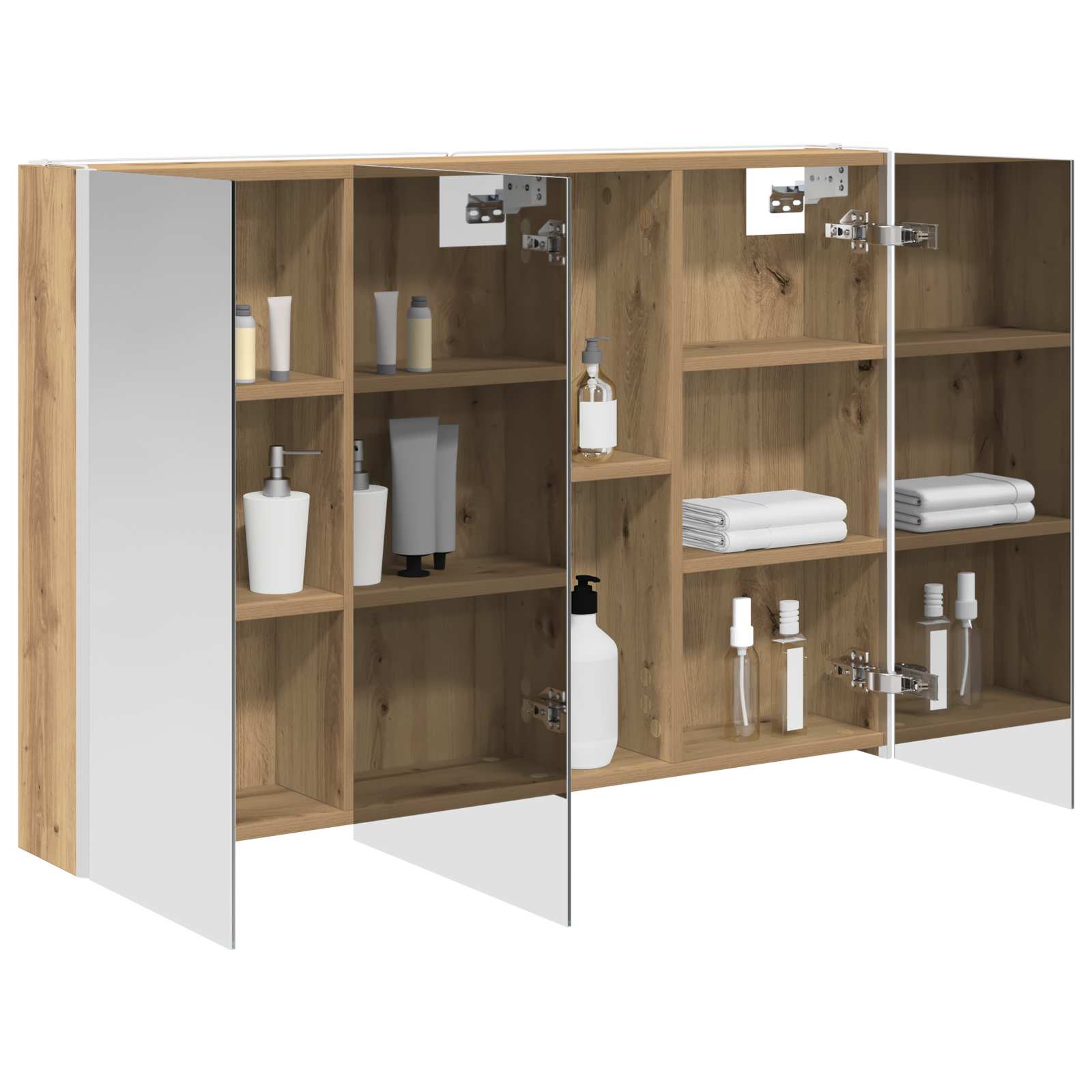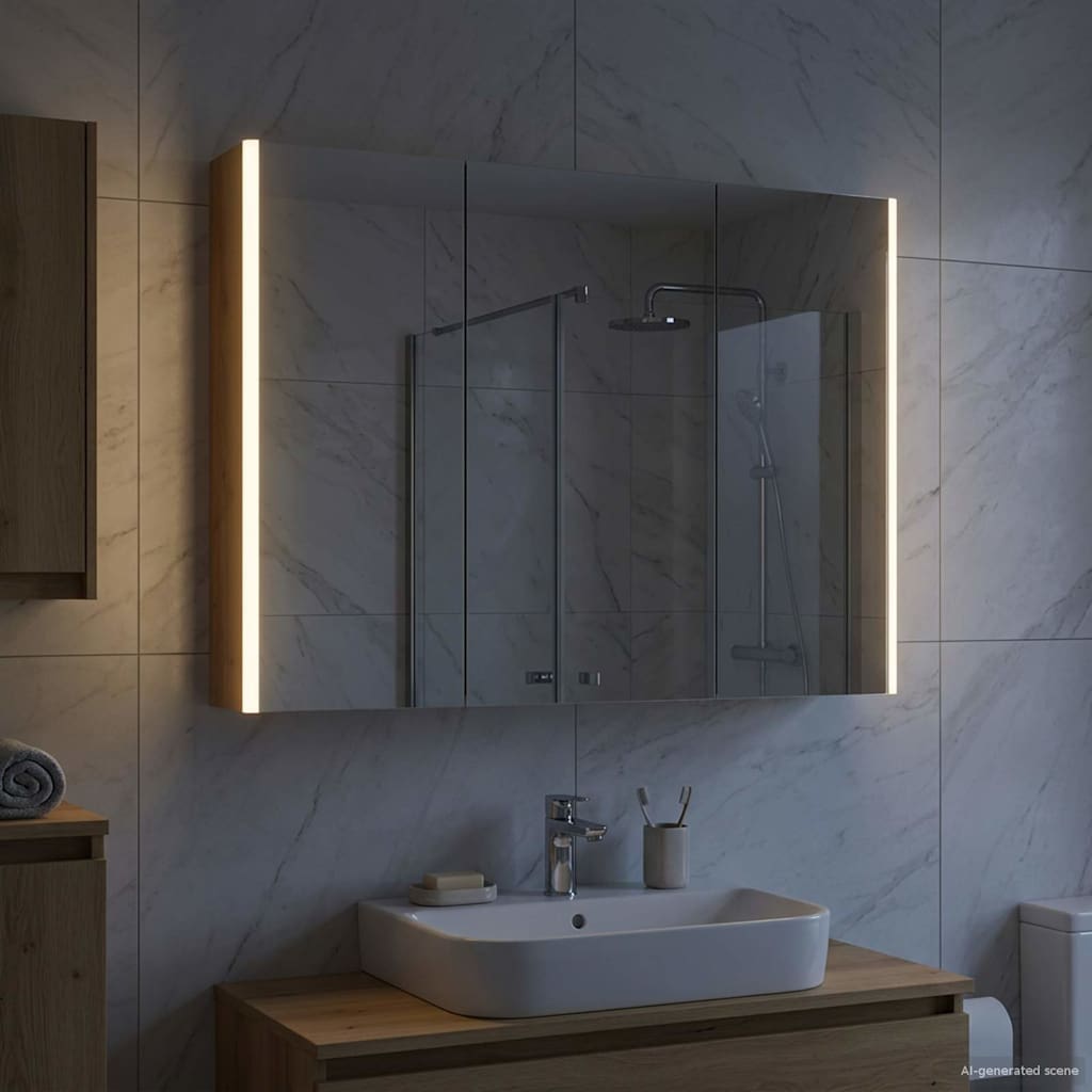 Tämä moderni kylpyhuoneen peilikaappi yhdistää tyylikkään muotoilun ja käytännölliset ominaisuudet, tehden siitä oleellisen lisän nykyaikaiseen kylpyhuoneeseen. Minimalistinen rakenne ja puhtaat linjat tarjoavat hienostuneen ilmeen, mutta kaappi on myös täynnä säilytystilaa päivittäisille tarvikkeille. Valaistus parantaa näkyvyyttä ja tunnelmaa, yhdistäen käytännöllisyyden ja muotoilun.