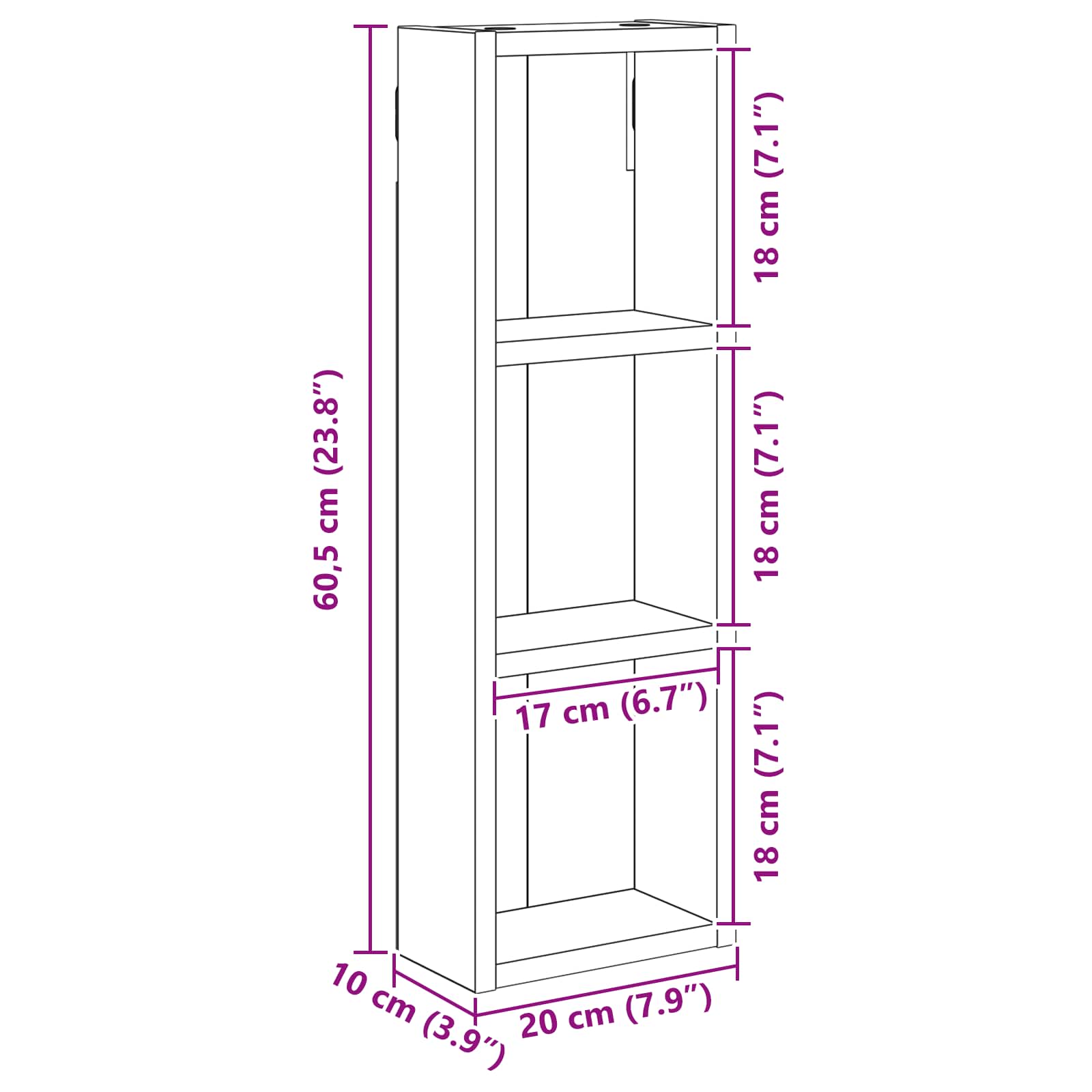 • Yleiset mitat: 20 x 10 x 60,5 cm (P x L x K)