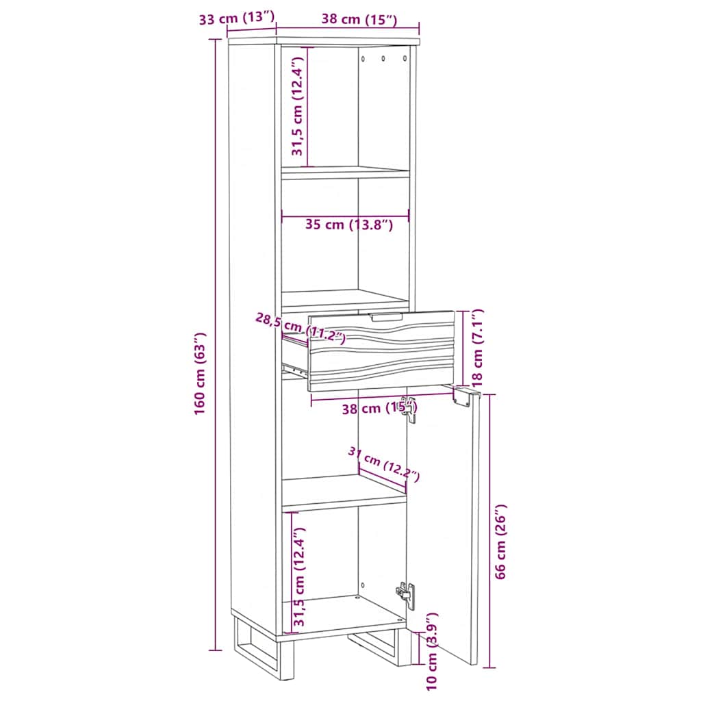 Tämä tyylikäs säilytyskaappi on juuri se, mitä tarvitset kylpyhuoneen tavaroiden järjestämiseen. Perinteisellä tyylillä valmistettu suorakaiteen muotoinen kaappi ja ihanat puupinnat sopivat täydellisesti sisustukseesi, tuoden ripauksen hienostuneisuutta mihin tahansa tilaan. Tyylikäs ja hyödyllinen kaappi tarjoaa runsaasti tilaa hygieniatuotteille, pyyhkeille ja muille tarvikkeille, täyttäen kaikki säilytystarpeesi.