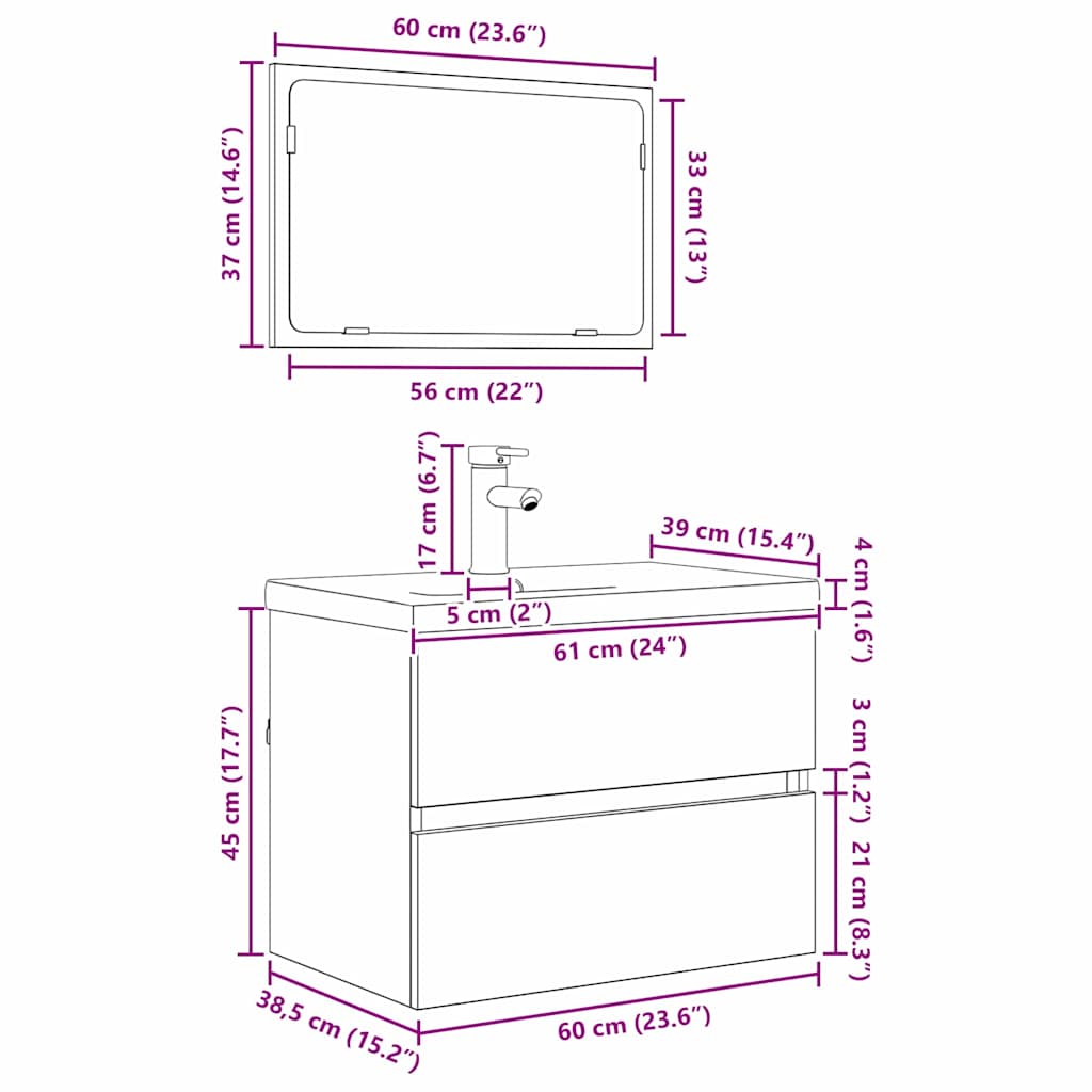 • Materiaalit: Tämä peilisetti on valmistettu teknisestä puusta ja metallista, joten se on rakennettu kestämään ja näyttää hyvältä. Metallikehys tuo lisää voimaa, kun taas teknisen puun sileä pinta pitää sen järkkymättömänä. Voit olla varma, että se kestää kulutusta, joten tämä peili on luotettava osa kylpyhuonettasi.