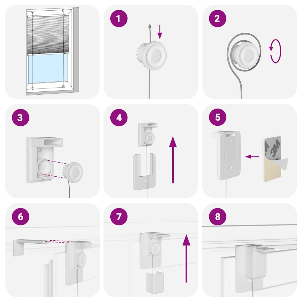 • Kaksi asennustapaa: Voit kiinnittää laskostetun kaihtimen seinään tai ikkunaan ruuveilla tai ilman porausta kiinnityskannattimilla tarpeen mukaan.