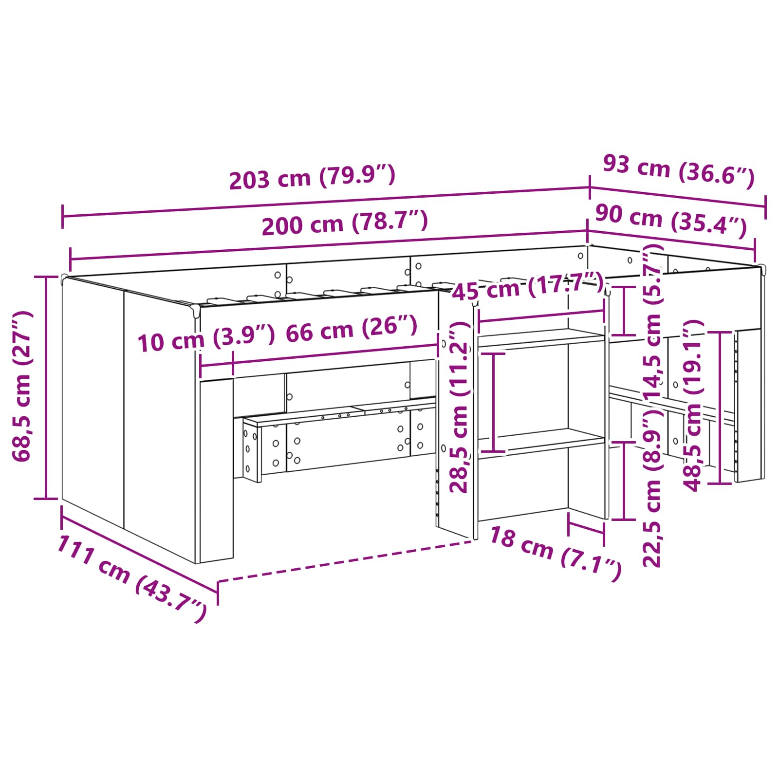 • Yleiset mitat: 203 x 111,1 x 68,5 cm (P x L x K)