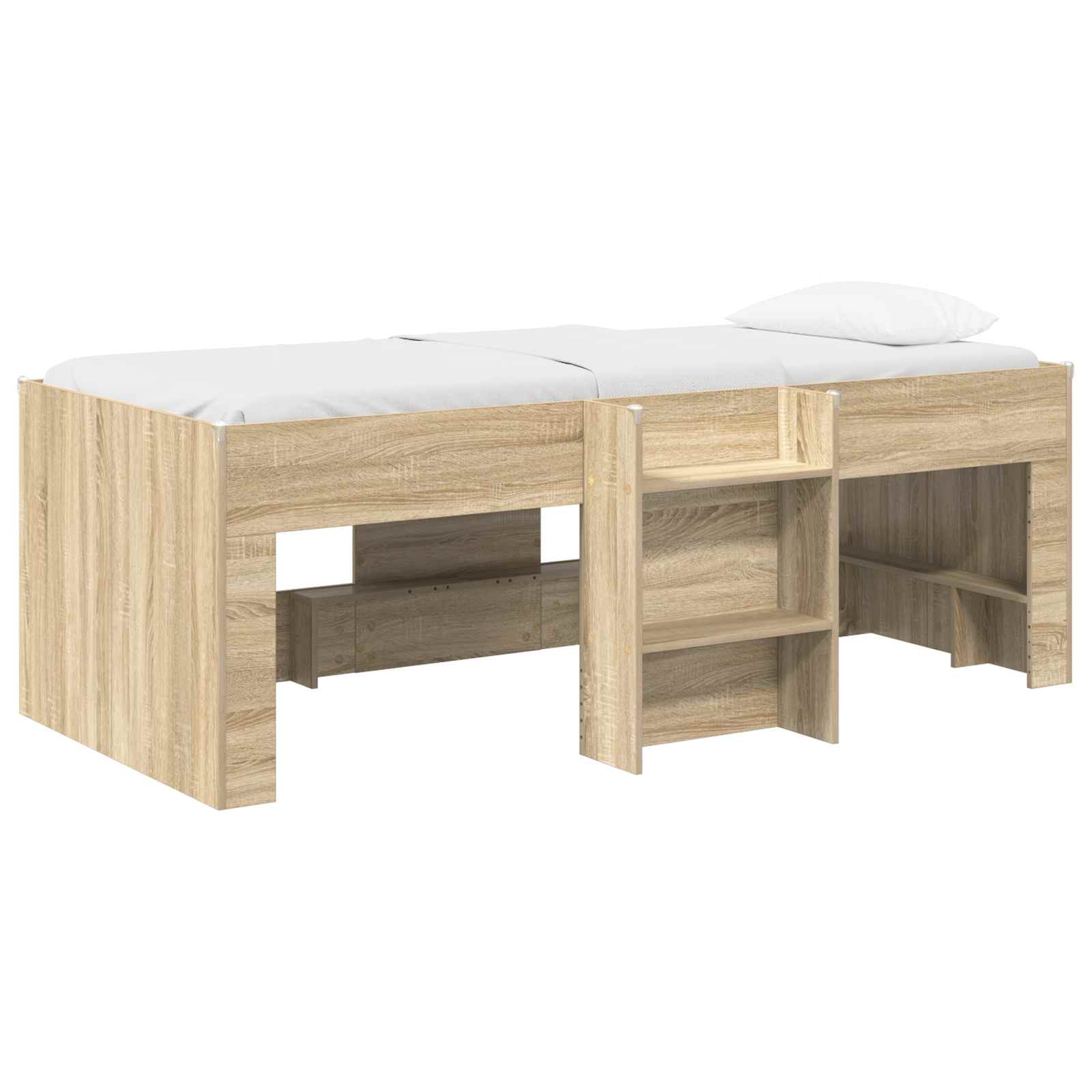 • Integroitu tikas pääsy: Varustettu integroiduilla tikkailla, jotka on suunniteltu helpottamaan ja turvallisen pääsyn loft-alueelle, tämä sängyn runko edistää itsenäisyyttä samalla varmistamalla lapsen turvallisuuden käytön aikana. Se on käytännöllinen ratkaisu, joka täydentää sängyn kohotettua muotoilua.