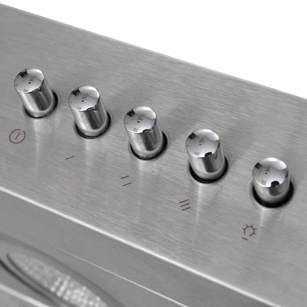 Siinä on tehokas 720 m³/t tuuletin, kolme pestävää alumiinista rasvasuodatinta ja sisäinen ilmastointireikä. 2 sisäänrakennettua LED-valoa valaisee ruoanlaittopinnan. Poistoputken pituus voidaan säätää välille 400 mm – 700 mm, sinun tarpeidesi mukaan. Siinä on 5 painiketta, jotka sallivat liesituulettimen helpon hallinnan.
