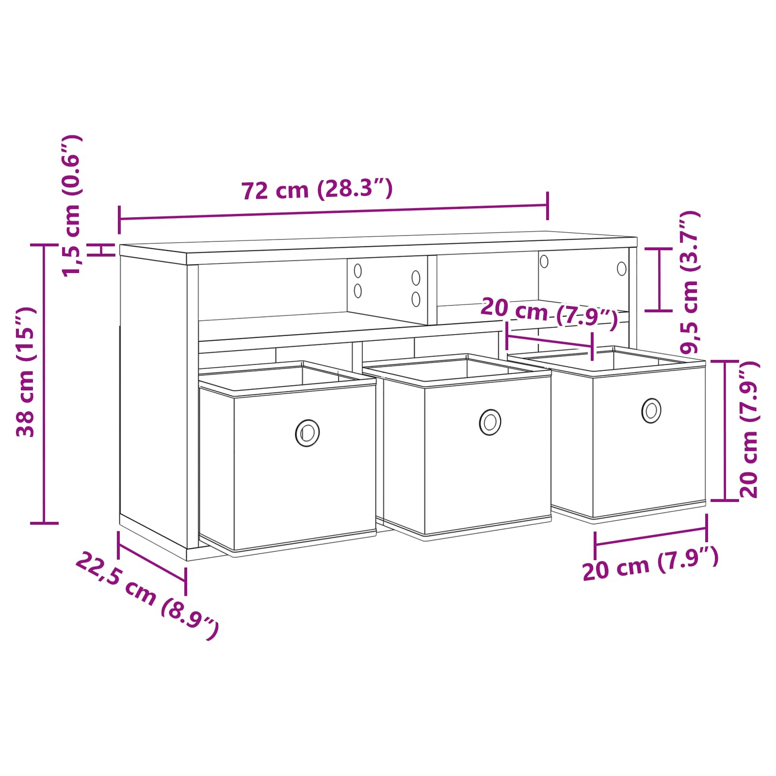 • Yleiset mitat: 72 x 22,5 x 38 cm (L x S x K)