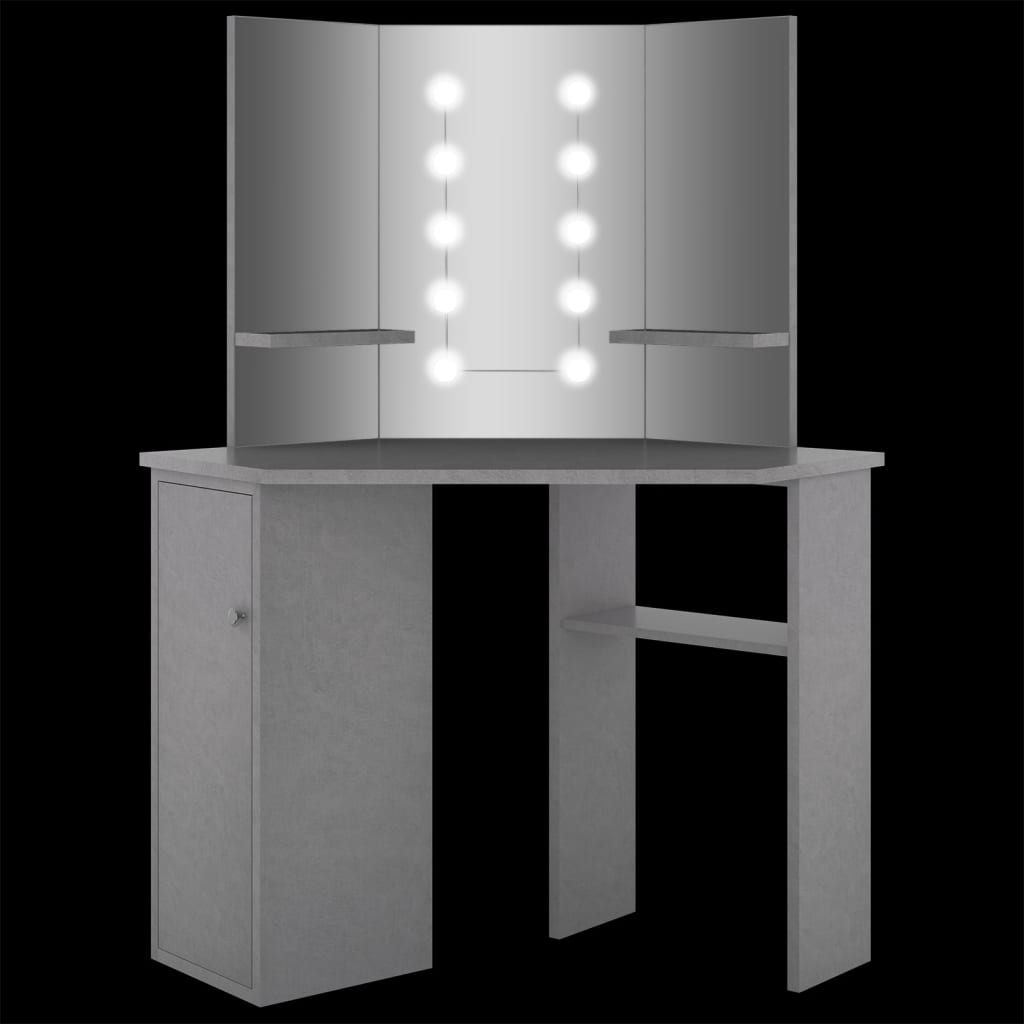 Laadukkaasta MDF:stä valmistettu meikkipöytä on sulavalinjainen ja moderni. Se sopii erinomaisesti huoneen kulmaan ja maksimoi säilytystilan pienessäkin kulmassa. Tilava kaappi ja avoin hylly pöydän alla tarjoavat tilaa meikeille ja kaikki pysyy helposti paikoillaan. Kaappi ja hylly avautuvat sivusuuntiin, jotta niihin pääsee helposti käsiksi myös pöydän ääressä istuessa. Kaunis kolmipaneelinen peili tarjoaa heijastuksen kolmesta kulmasta meikkausta varten ja tuo pöytään eleganssia. Peilissä on matalat hyllyt, joille voit asettaa kupit, meikkisudit, voiteet, hajuvedet ja koriste-esineet. Mukana tulevat elegantit LED-valot valaisevat kauneutesi.