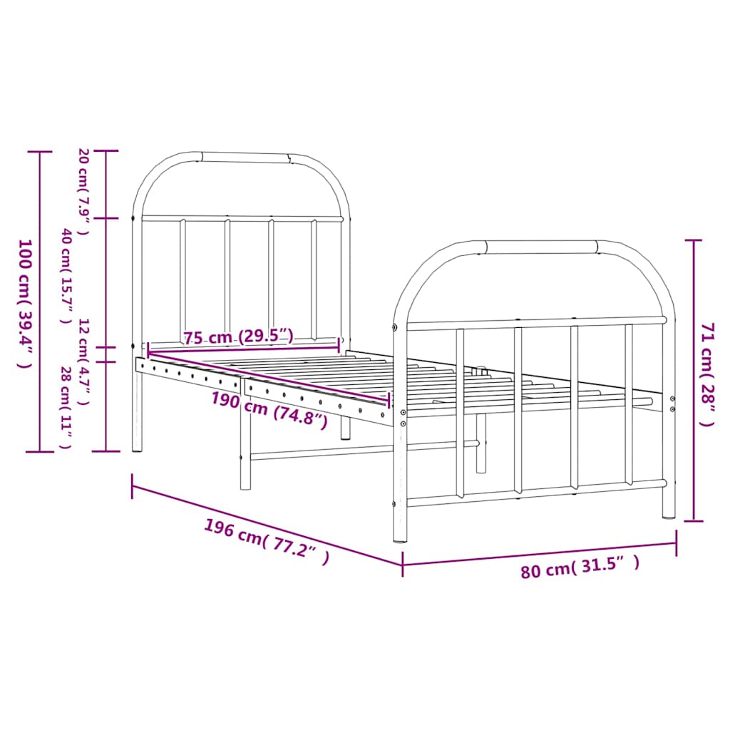 Metallinen sängynrunko päädyillä musta 75×190 cm