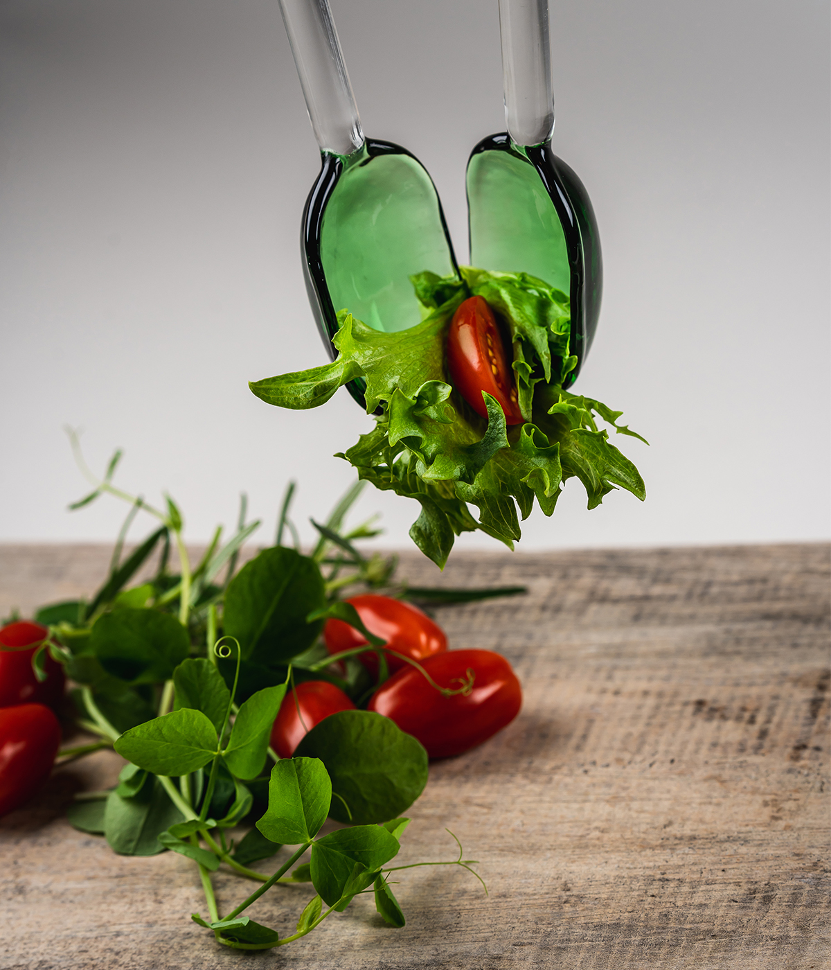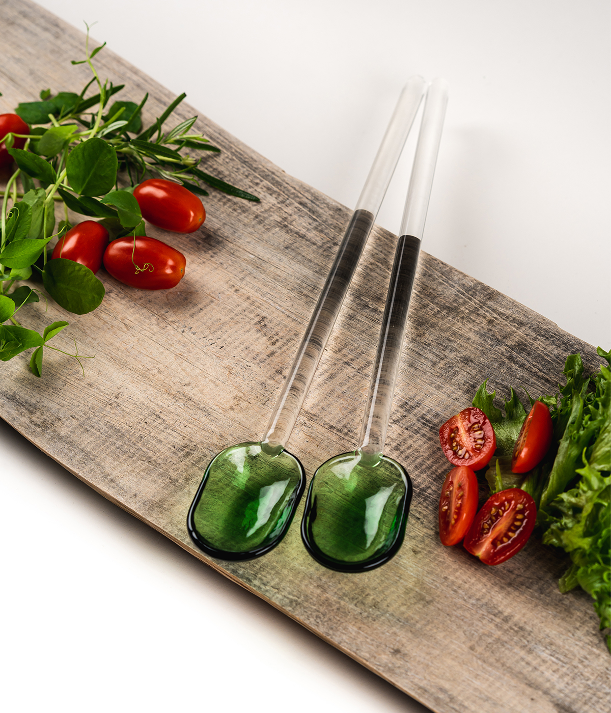 Tarjoile raikkaat salaatit lasisilla salaatinottimilla! Käsintehdyt ottimet on saatavilla kirkkaan lasin ja vihreän värin yhdistelmänä. Konepesun kestävät. Ottimien pituus on 30 cm.