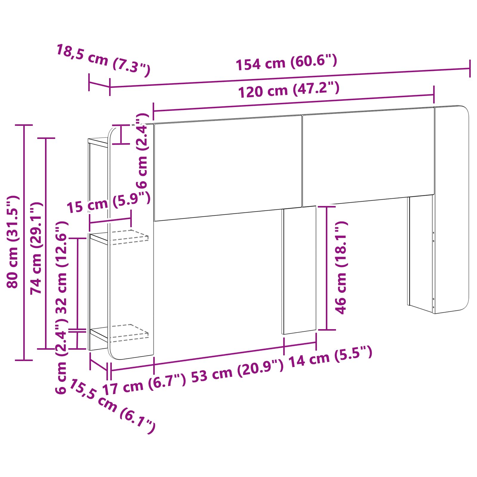 • Yleiset mitat: 154 x 18,5 x 80 cm (P x L x K)