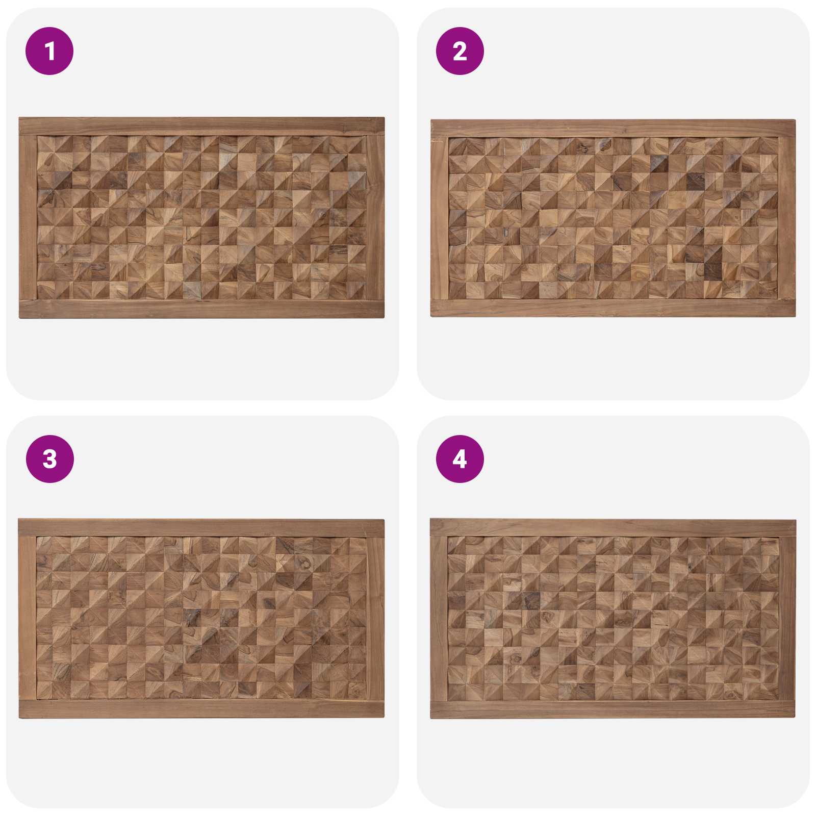 • Täysi tiikkipuu: Tämä päätylauta on valmistettu kestävästä ja vedenkestävästä tiikkipuusta, joka tuo tilaan ainutlaatuista tekstuuria ja lämpöä. Tiikin kestävyys takaa, että päätylauta pysyy kauniina pidempään.