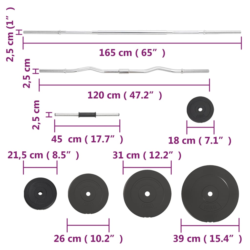 • Levyjen painot: 4 x 2,5 kg, 6 x 1,25 kg, 2 x 10 kg, 2 x 5 kg, 2 x 15 kg