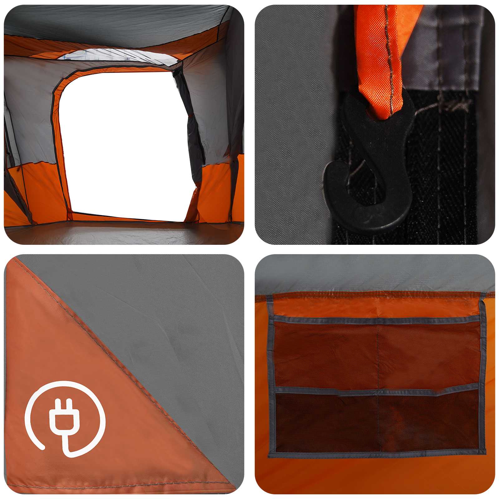 • Käytännön ominaisuudet Teltassa on verkkopaneelit ilmavuutta varten, irrotettava sadepeite suojaksi ja integroitu E-portti kaapeleille. Sisätaskut tarjoavat säilytystilaa ja jakaja lisää yksityisyyttä, kun taas lyhtykoukku tukee valaistusta.