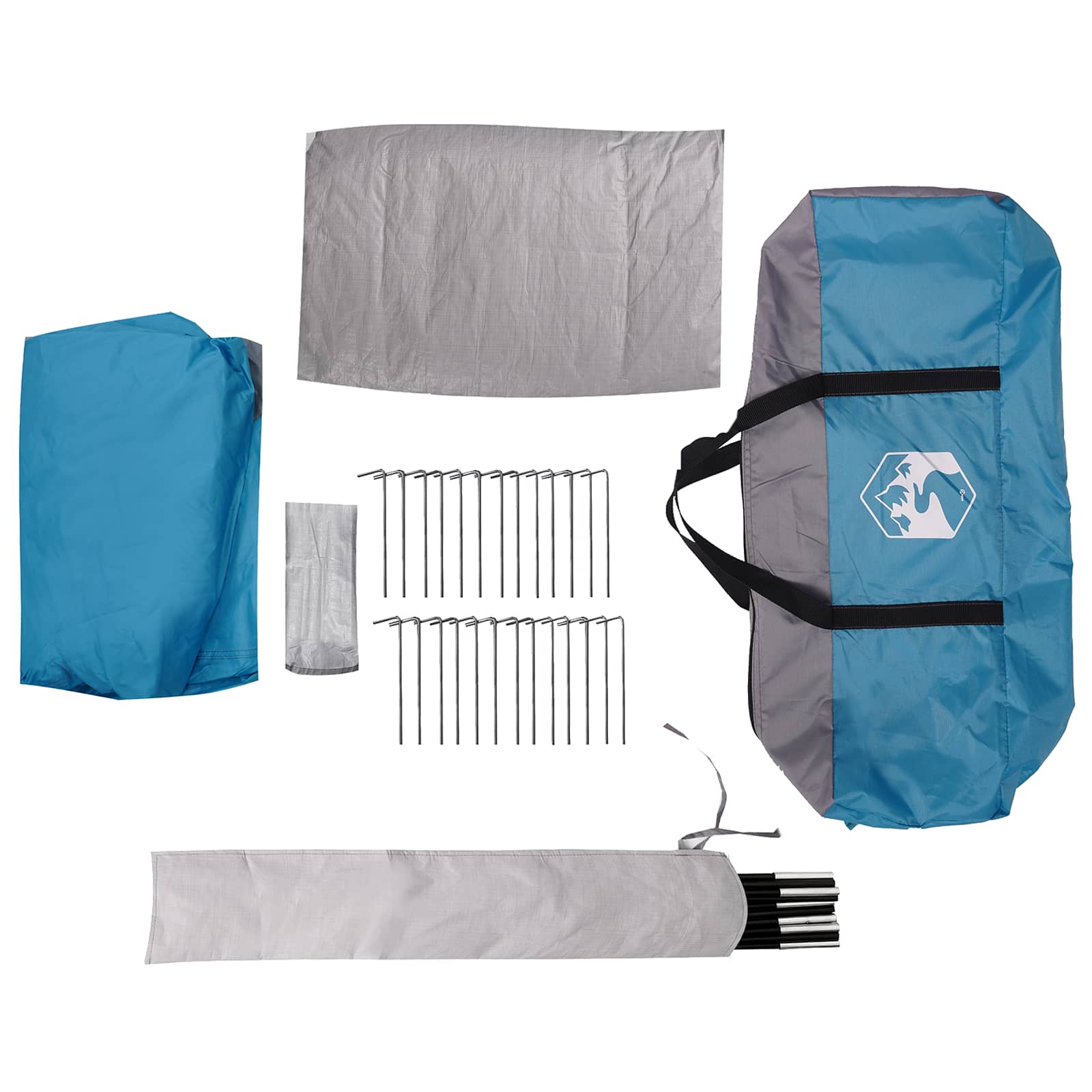 • Vahva rakenne Lasikuitu- ja teräsputkikoostumus tarjoaa jämäkän kehyksen, joka kestää ulkoisia vaikutuksia. Tämä varmistaa teltan pysyvän tukevana ja turvallisena kaikissa olosuhteissa, jotta voit nauttia leirielämästä ilman huolia.