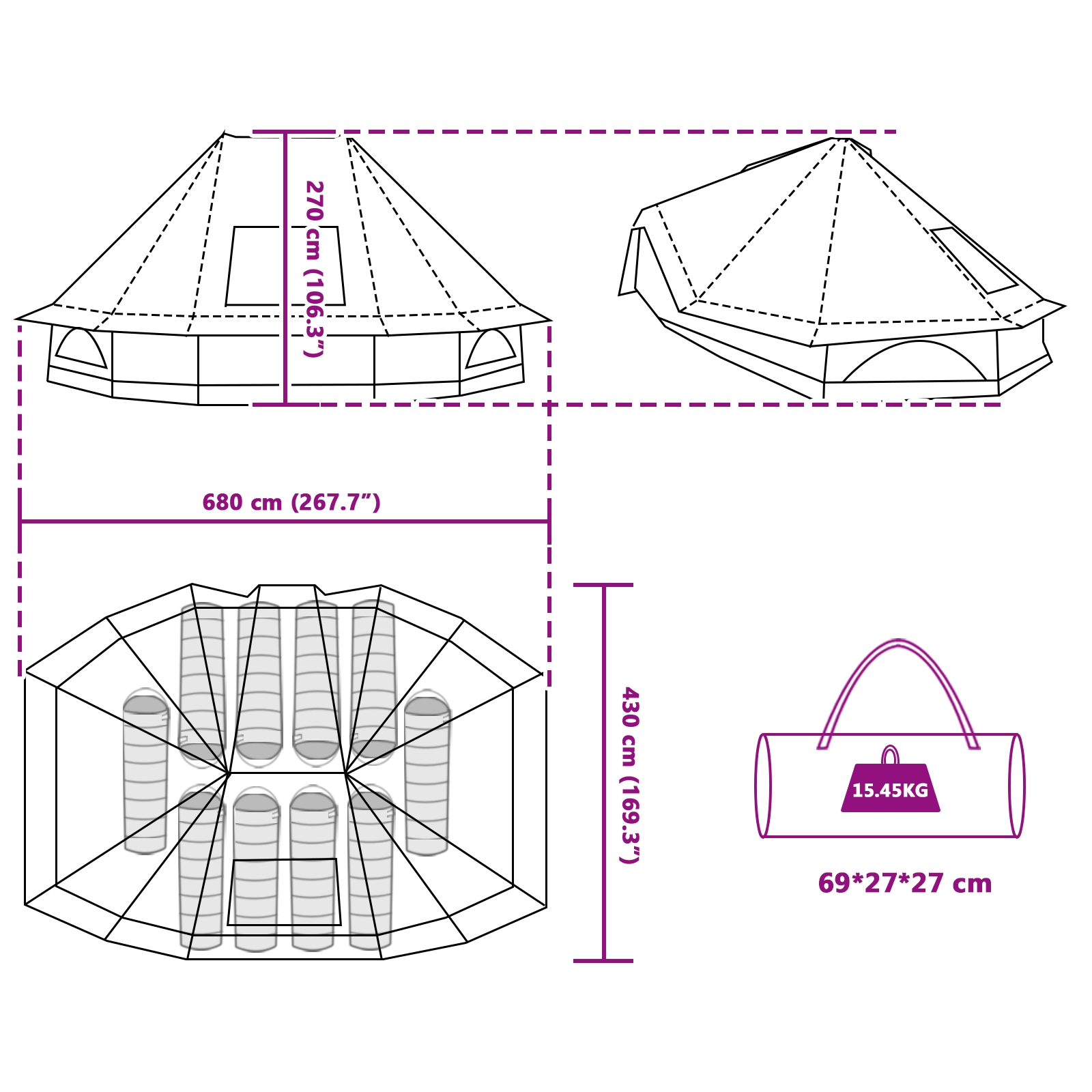 Tämä Tipi-teltta on mahtava ulkotila leirintään. Sen tyylikäs kartion muoto yhdistää muotoilun ja käytännöllisyyden. Kestävästä materiaalista valmistettuna se tarjoaa runsaasti tilaa rentoutumiseen tai mukaviin kokoontumisiin tähtien alla. Täydellinen kumppani leirintäretkillä, perhetilaisuuksissa tai ulkoilmajuhlissa.