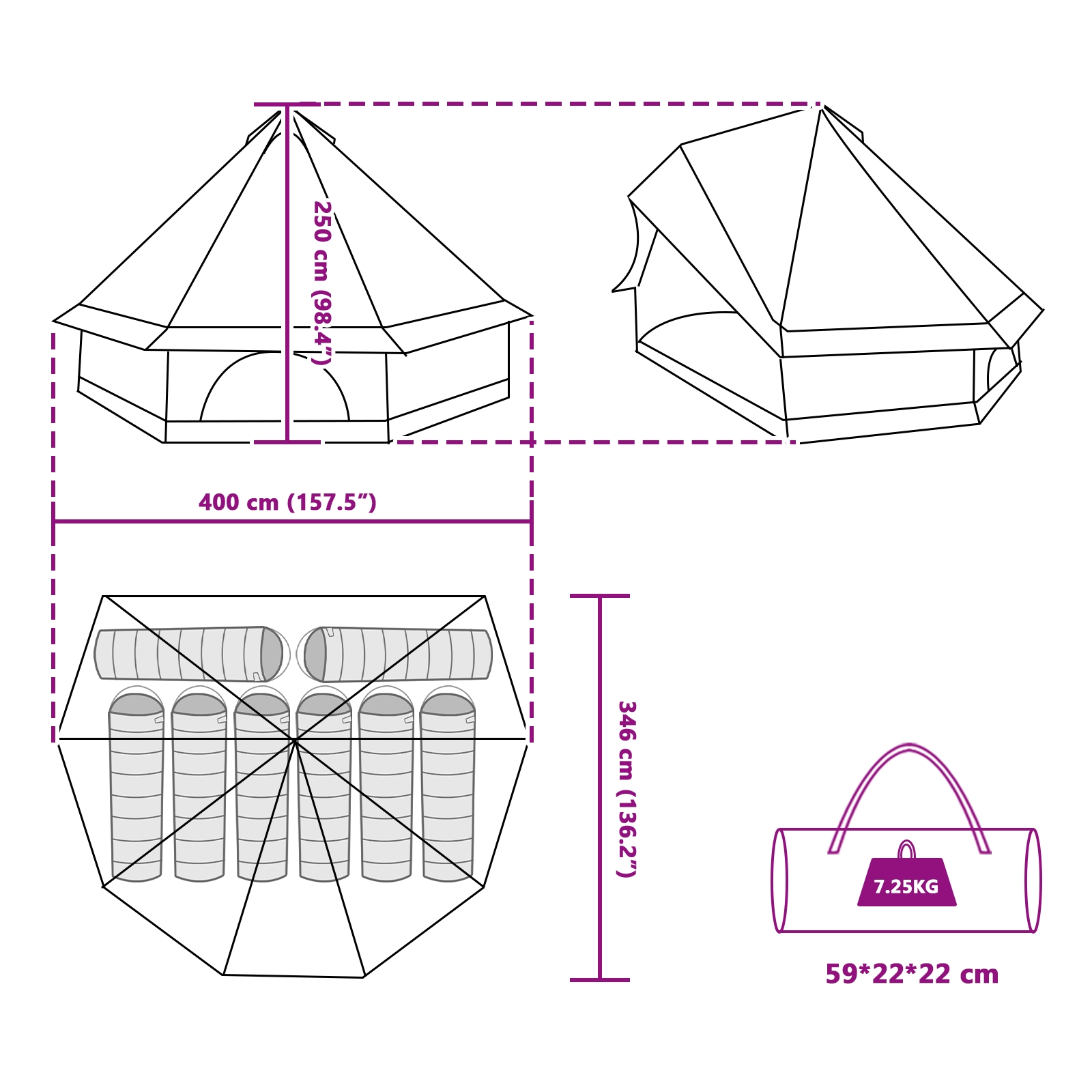 • Iso sisustus: 400 x 346 x 250 cm, tämä teltta tarjoaa runsaasti tilaa jopa 8 hengelle, upea perhematkoille tai kaveritapaamisille. Voit nukkua ja rentoutua ilman ahtaan tunnetta.
