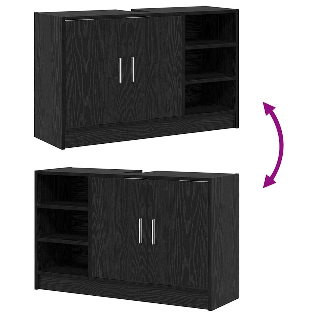 Tämä pesukaappi tuo ripauksen tyyliä kylpyhuoneeseesi, yhdistäen modernin muotoilun ja fiksun varastoinnin. Se on tehty teknisestä puusta ja siinä on tyylikäs musta tammiviimeistely, joka lisää ulkonäköä ja takaa kestävyttä.