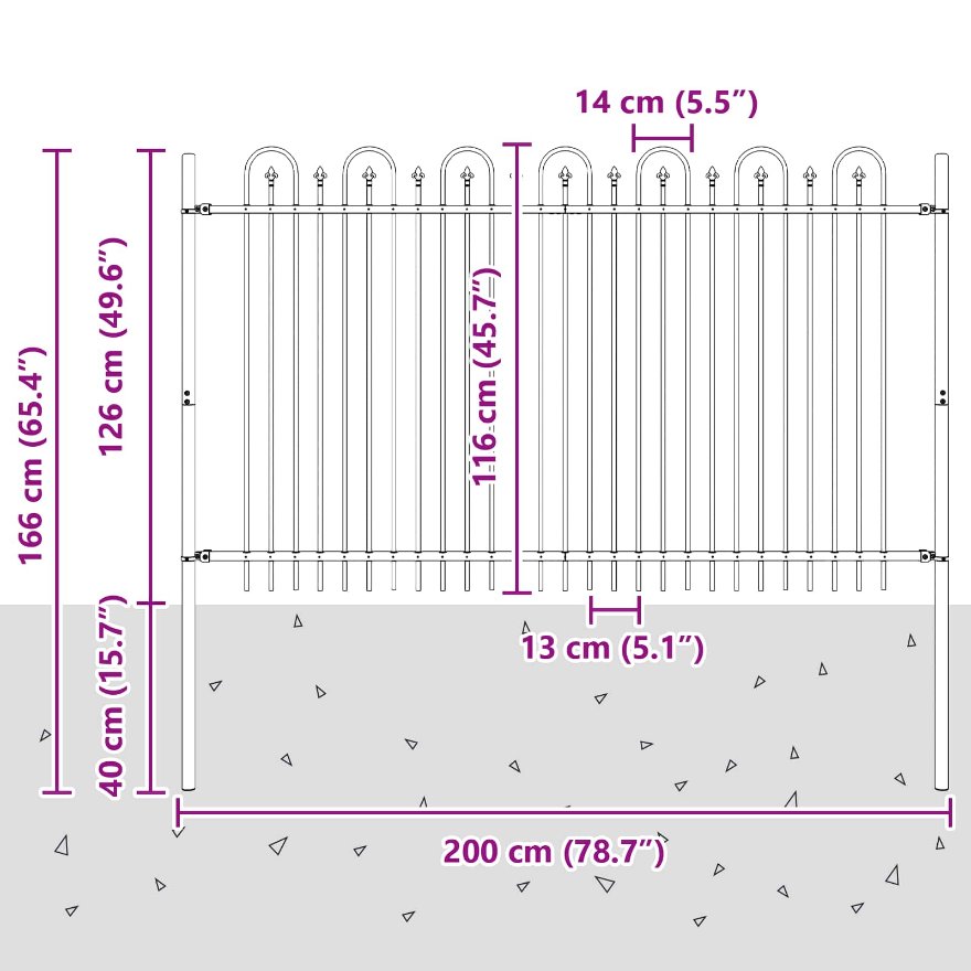 • Ominaisuudet: Jauhemaalattu teräs takaa tyylikkyyden ja kestävyyden, joten aita on pitkäaikainen osa ulkotiloja. Teräs on käsitelty säänkestäväksi, tassäy ja pitkä käyttöikä käy käsi kädessä hienostuneen ilmeen kanssa. Tämä materiaalivalinta vaatii vain vähän huoltoa, pidä ulkotilat siisteinä.