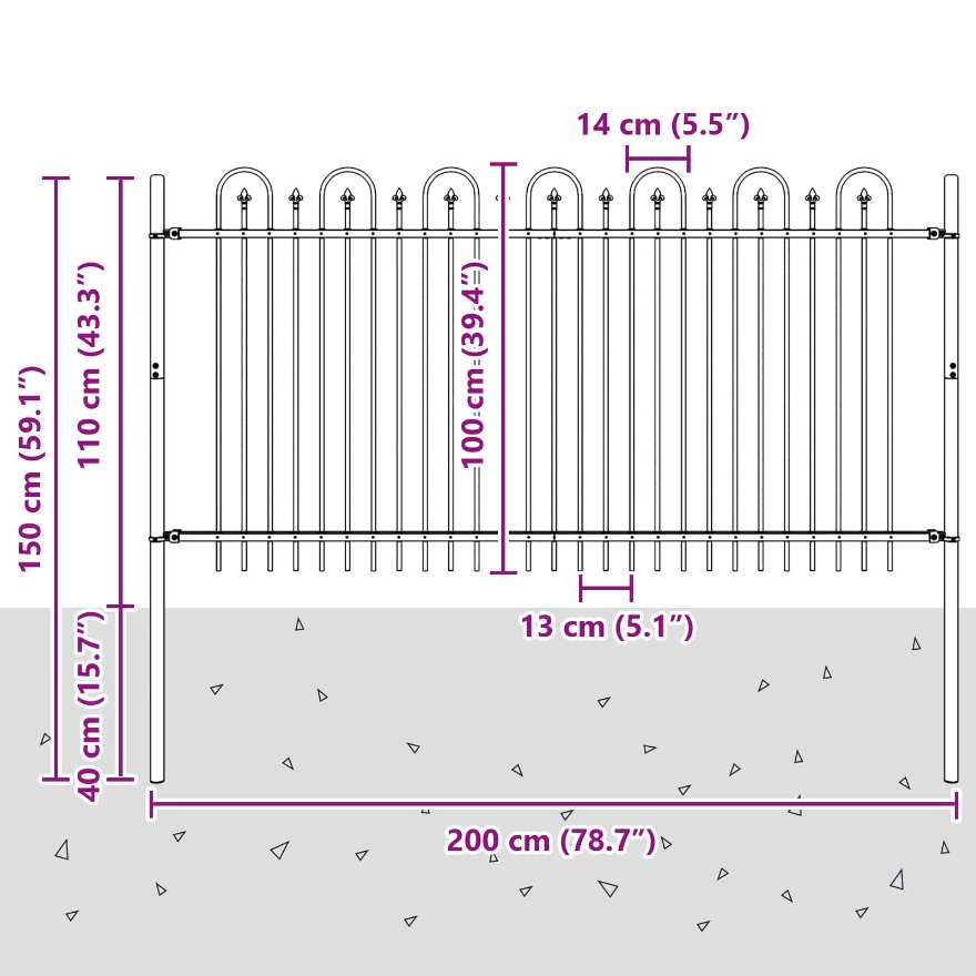 • Ominaisuudet: Jauhemaalattu teräs takaa tyylikkyyden ja kestävyyden, joten aita on pitkäaikainen osa ulkotiloja. Teräs on käsitelty säänkestäväksi, tassäy ja pitkä käyttöikä käy käsi kädessä hienostuneen ilmeen kanssa. Tämä materiaalivalinta vaatii vain vähän huoltoa, pidä ulkotilat siisteinä.