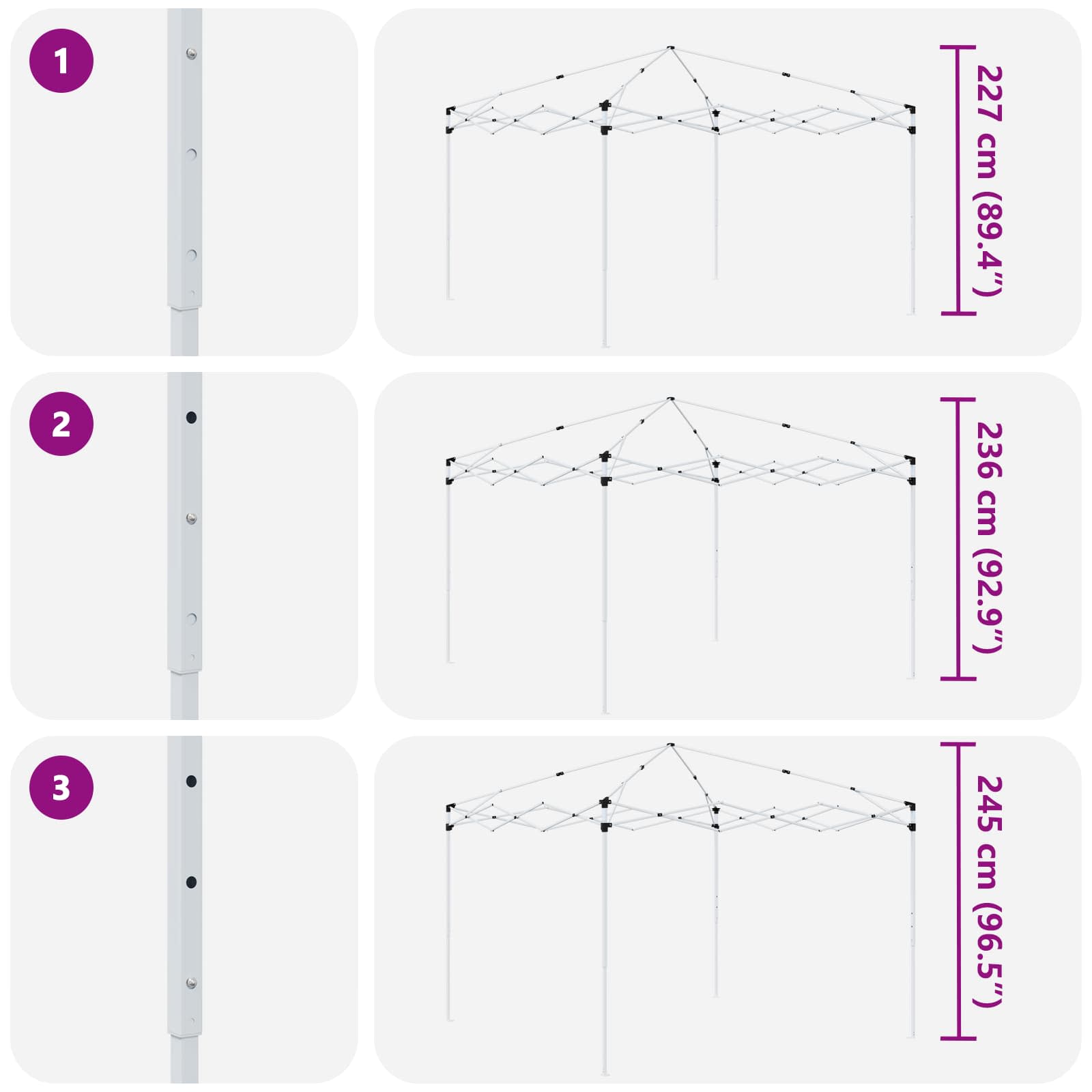 • Korkeuden säätö: Teltta säätyy kolmeen korkeuteen, 227 cm:stä 245 cm:iin. Tää ominaisuus lisää joustavuutta, joten voit säätää sen korkeuden tapahtuman mukaan ja varmistaa kaikkien mukavuuden.