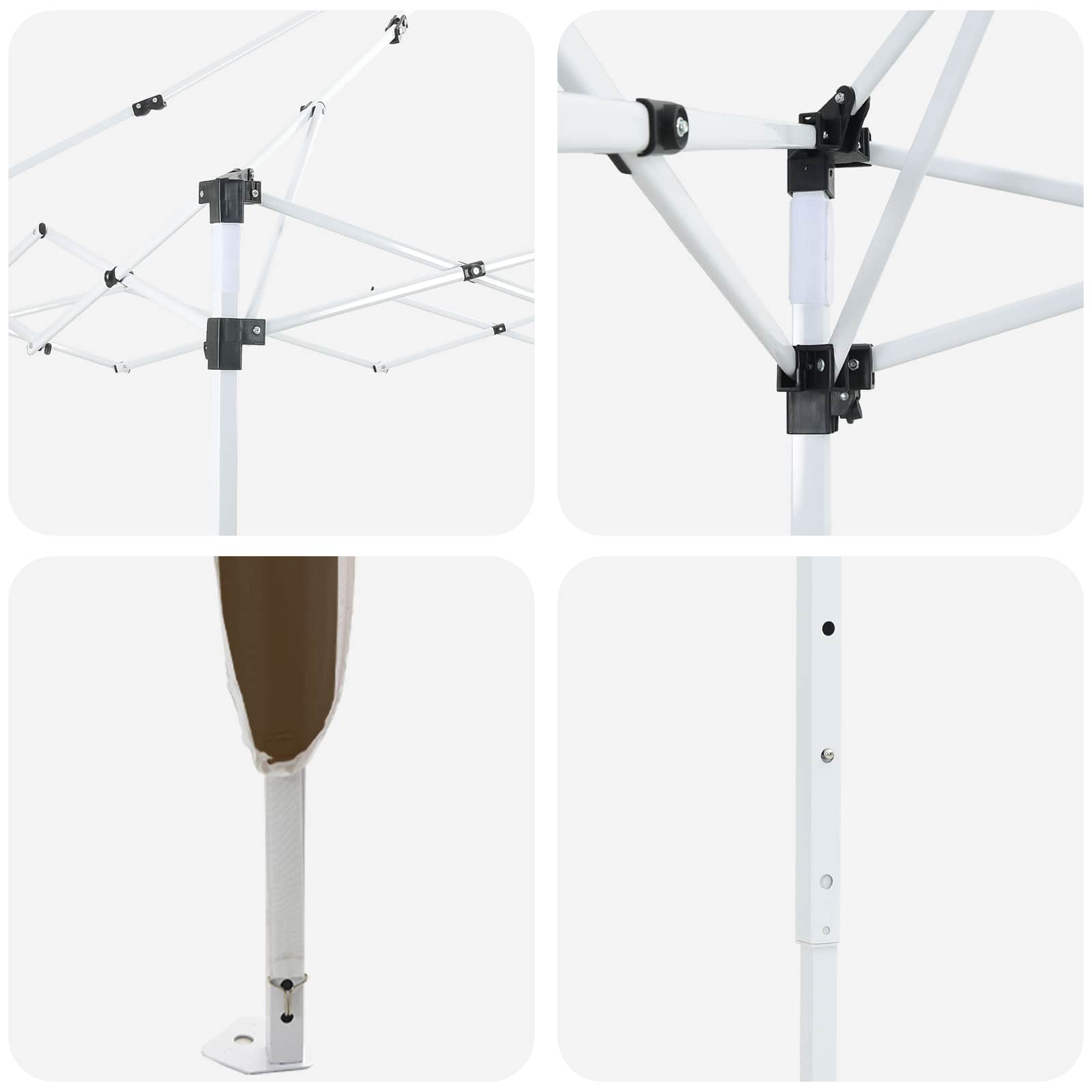• Kestävä Oxford-kangas: Teltan päämateriaali tarjoaa hyvän suojan erilaisille sääolosuhteille. Sen vedenpitävyys ja UV-suoja pitävät mukavan tunnelman yllä, suojaten sekä vieraita että kalusteita auringolta ja kevyeltä sateelta.