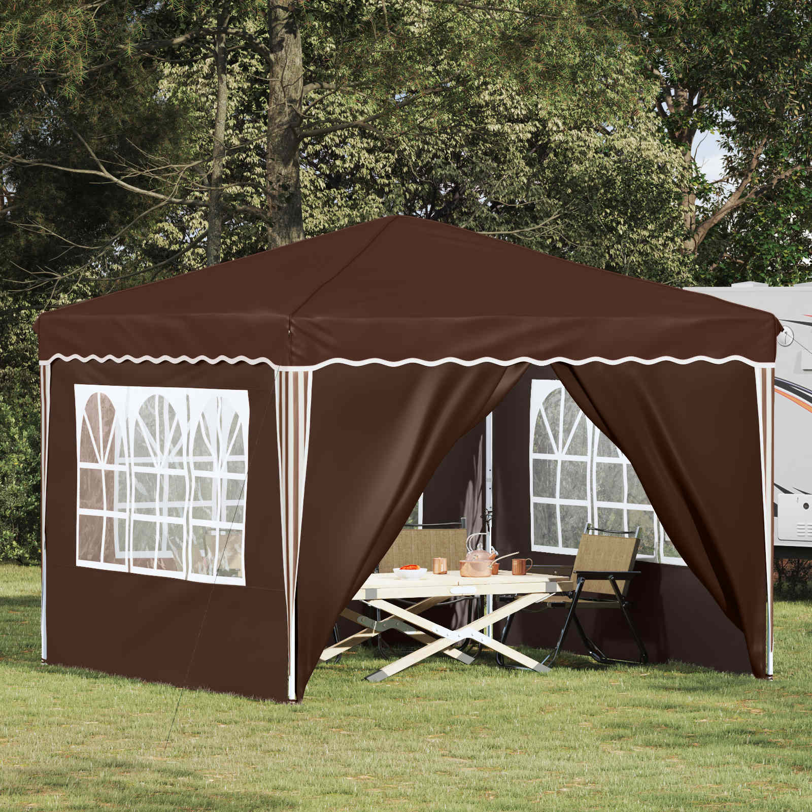 Oxford pop-up juhlateltta on mahtava valinta ulkona juhlimiseen. Se tarjoaa tyylikkään ja modernin suojan, jossa on reilusti tilaa. Selkeät linjat ja yksinkertaisuus tekevät tästä teltasta täydellisen puutarhaasi. Se on loistava valinta erilaisiin tapahtumiin, muuttaen minkä tahansa ulkotilan eläväksi ja houkuttelevaksi paikaksi. Hienostunut muotoilu tekee siitä idean häihin, juhliin tai suuriin ulkoistapahtumiin, jotta vieraasi voivat nauttia ulkoilmasta mukavasti.