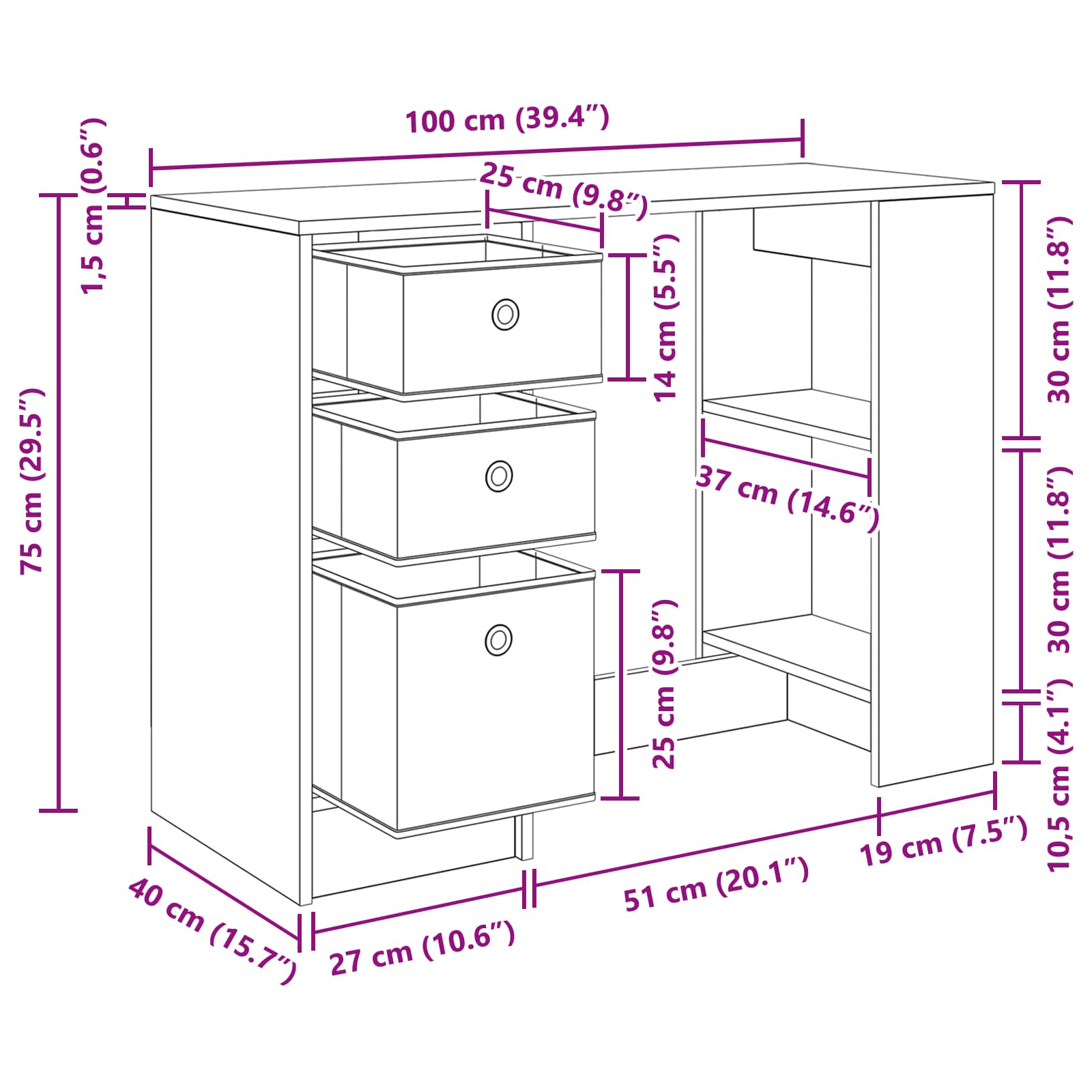• Toiminnalliset laatikot Pöytä sisältää useita käytännöllisiä laatikoita, jotka mahdollistavat siistin ja järjestelmällisen tilan. Syvennetyt kahvat luovat huomaamattoman ilmeen, parantaen samalla käytäntöä. Olipa kyse asiakirjoista tai muista tavaroista, laatikoiden älykäs sijoittelu maksimoi tilan käytön ilman tyylin uhraamista.