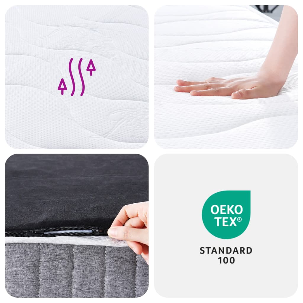 • Parannettu mukavuus: Joustinpatjassa on useita kerroksia, mukaan lukien vaahtomuovikerros, eristepehmustettu kerros ja jousikerros. Tämä yhdistelmä tarjoaa pehmeän tai keskikovan tuntuman ja kehosi tuntuu mukavalta kaikissa nukkuma-asennoissa. Lisäksi patja vaimentaa tehokkaasti liikkeen ja kääntyilyn aiheuttamaa ääntä ja värinää, varmistaen rauhallisen ja häiriöttömän unen.