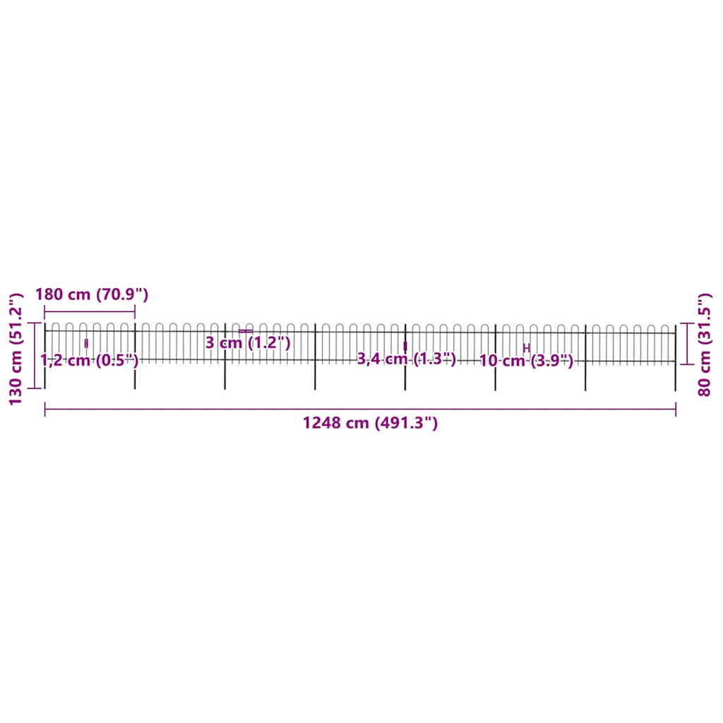 Luo tyylikäs aita puutarhasi, kotisi tai kävelyreittisi ympärille puutarha-aidallamme! Tämä koristeellinen teräksinen puutarha-aita koostuu 7 aitapaneelista ja 8 tolpasta ja on yhteensä 11,9 metriä pitkä. Se muodostaa vankan, turvallisen ja huoltovapaan suoja-aidan puutarhan, kodin tai kaupallisen tontin ympärille.