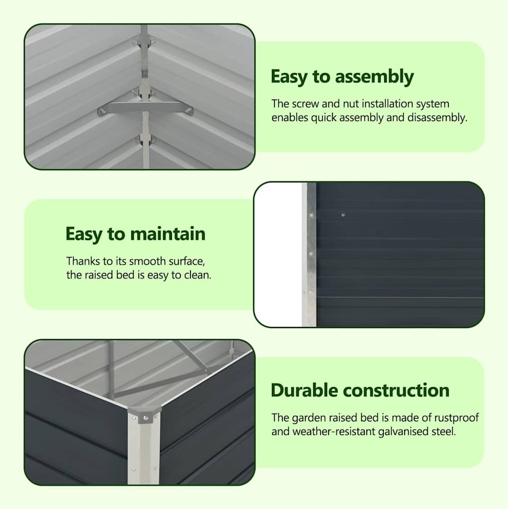 Galvanoidusta teräksestä valmistettu ja kiinnikkeillä varustettu istutuslaatikko on erittäin tukeva ja kestävä. Lisäksi laatikon reuna on suunniteltu siten, että vaarallisia teräviä reunoja ei paljastu. Puutarhalaatikko on helppo koota.