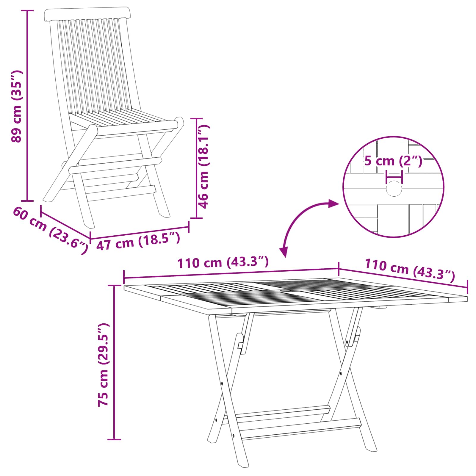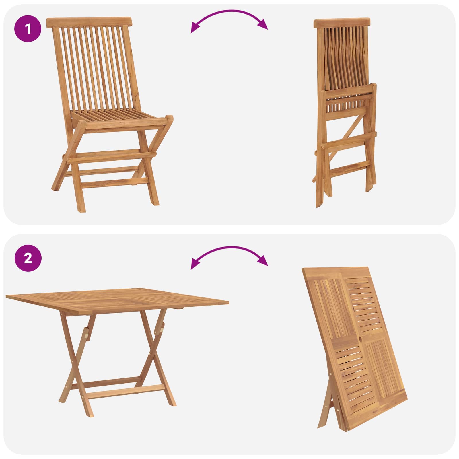 Tämä kestävä tiikkikalustesetti sisältää taitettavan pöydän ja tuolit, jotka sopii puutarhoihin, terasseille ja patiolle. Sen rakenne auttaa veden valumisessa, ja keskellä on reikä varjostimelle. Setti on täydellinen kesän kokoontumisiin tai päivittäiseen käyttöön, ja taitettavan muotoilun ansiosta sitä on helppo varastoida, kun kalusteita ei tarvita.