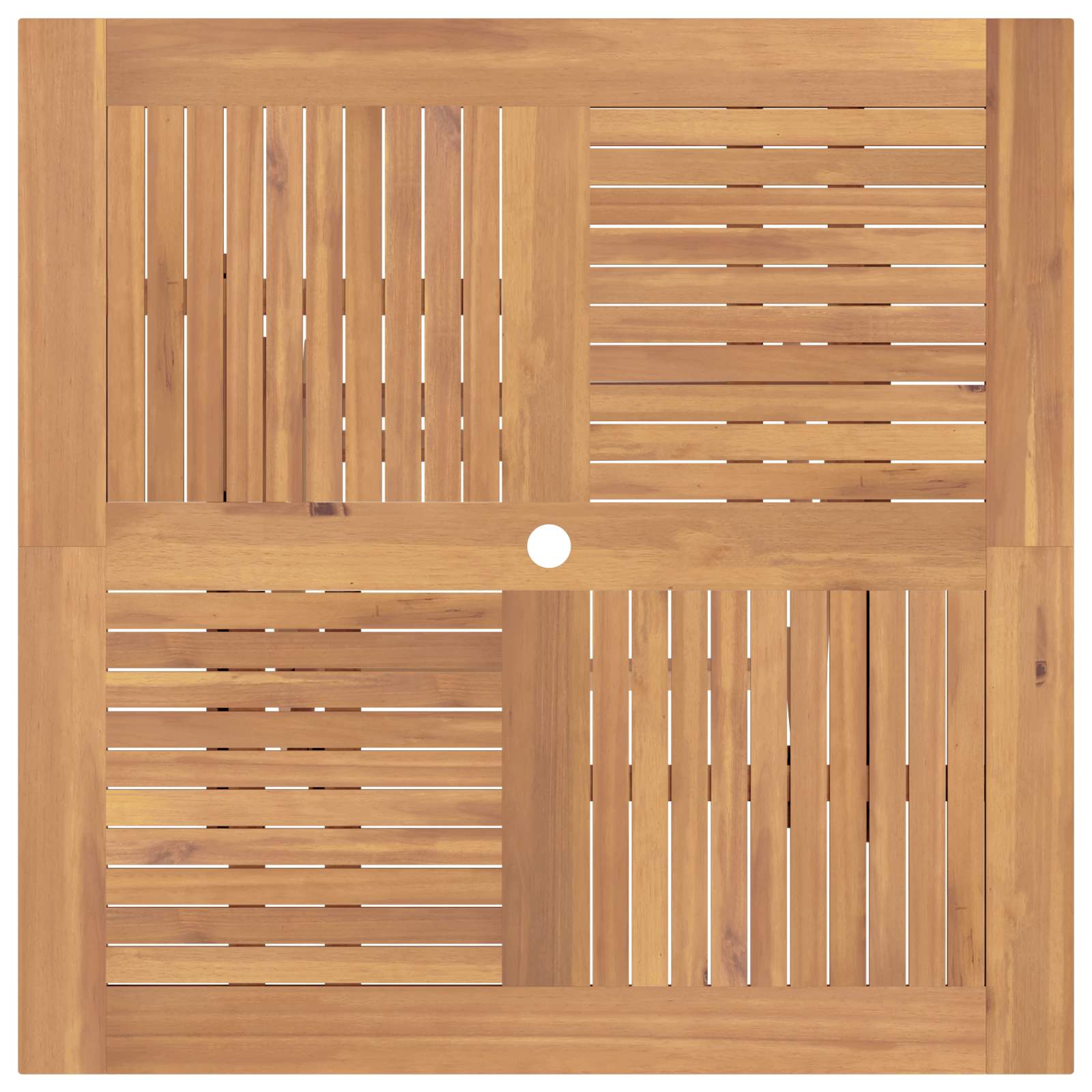 Pöydässä on valmiiksi porattu reikä. Tää kaikille sopiva reikä kaivaa paikan standardikokoisille aurinkovarjoille.