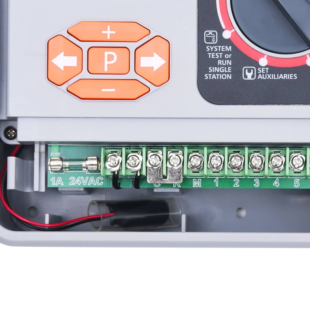 Kasteluajastin voi hallita 4, 6, 9 tai 11 venttiiliä. Kastelujärjestelmän ohjaimessa on kuusi kasteluohjelmaa, joissa kussakin on aloitusaika, loputusaika ja käyttöaika. Kasteluaikataulu voidaan asettaa viikon jokaiselle päivälle tiettyjen aloitus- ja lopetusaikojen kera. Käyttöaika voidaan asettaa 1 minuutin ja 12 tunnin 59 minuutin välille. Puutarhan kastelujärjestelmän hallintalaite toimii verkkovirralla ja sitä voidaan käyttää helposti pyörittämällä ja painamalla painikkeita valintaa ja varmistamista varten. Ohjauspaneeliin voidaan liittää sadetunnistin ja kosteusanturi (eivät mukana toimituksessa). Niiden avulla voidaan ohittaa kastelukerta ja maksimoida veden säätäminen sadepäivinä tai kun maaperä on liian märkä. 9 V alkaliparisto (ei mukana toimituksessa) tarvitaan, jotta digitaalinen kello pysyy ajassa ja muistitoiminnot toimivat.