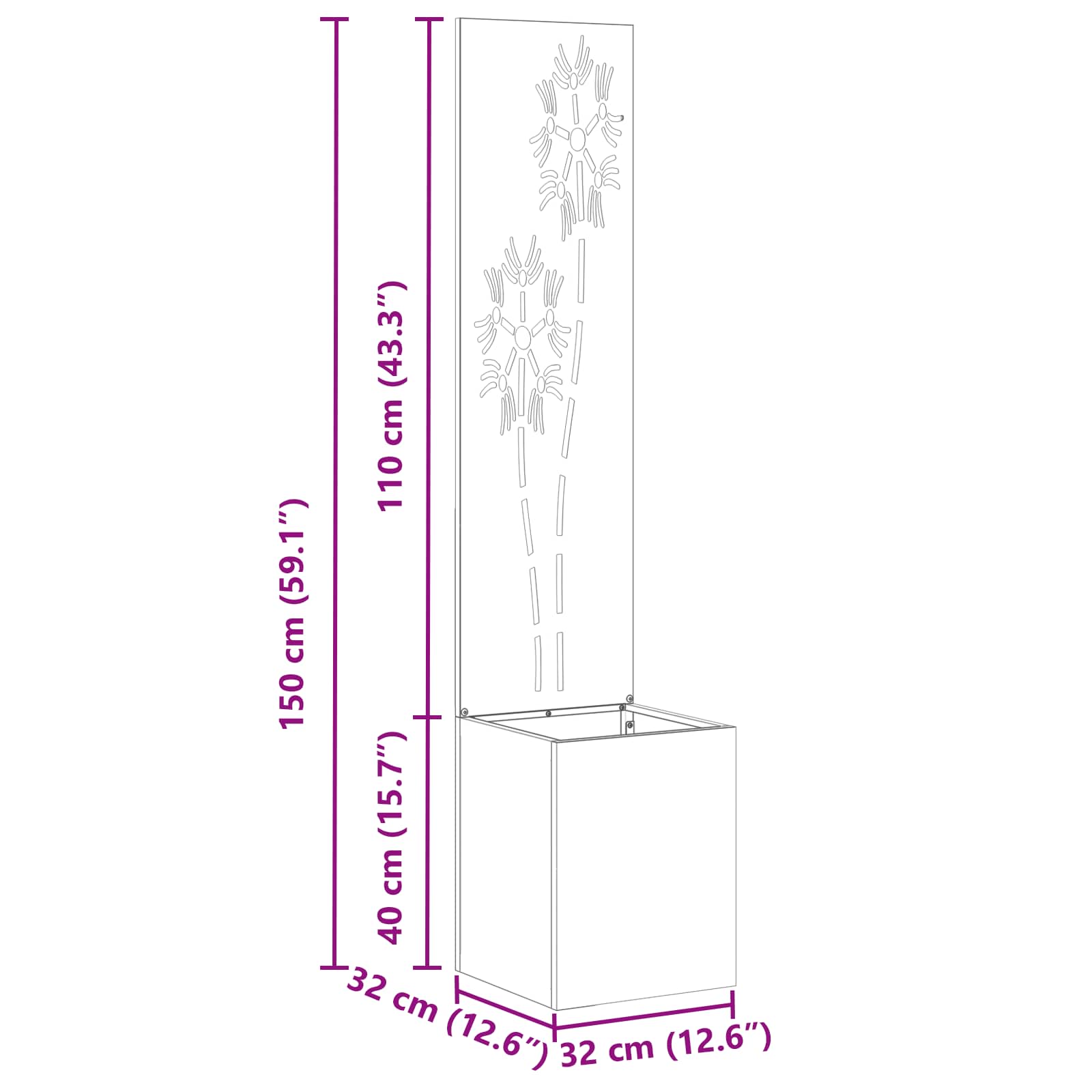 Puutarhan ruukkukasvi koristepaneelilla Ruosteinen 32 x 140 cm