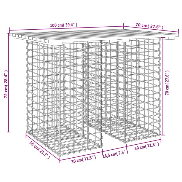 • Tukeva ja vakaa jalusta: Tämän ulkopenkin alaosana toimii galvanoidusta teräksestä valmistettu kivikori, joka on suunniteltu täytettäväksi kivillä tai soralla lisäkauneuden luomiseksi. Teräsverkko on hitsattu poikki- ja pituussuuntaisilla rautalangoilla jokaisessa risteyskohdassa ylimääräisen vakauden takaamiseksi.