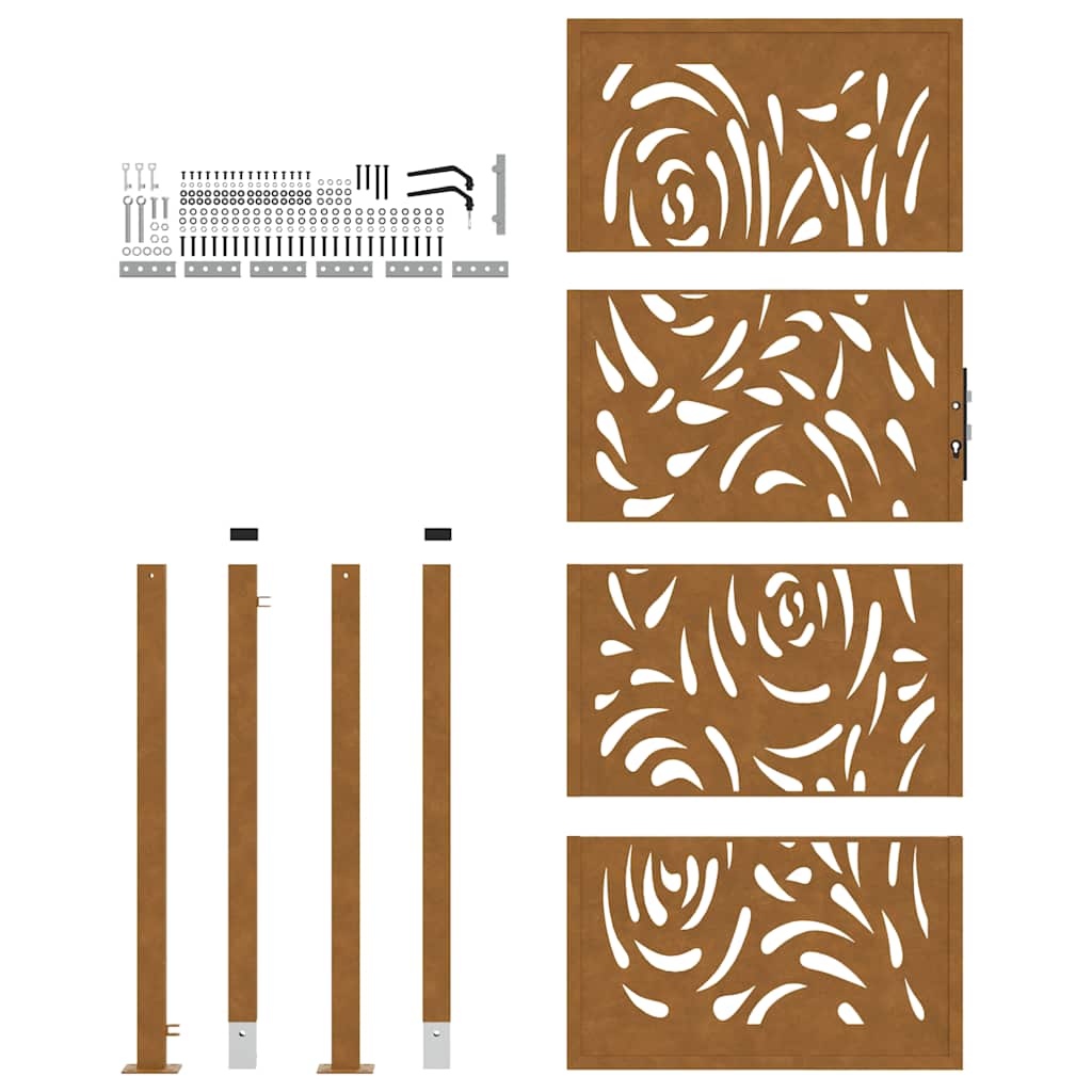 • Kestävä rakenne: Tämä aitaportti on valmistettu säänkestävästä teräksestä. Säänkestävä teräs on luonteeltaan ruosteenestävä. Se kehittää ruosteisen suojakerroksen korroosiota vastaan, kun se altistuu ensimmäistä kertaa ilmakehän olosuhteille. Sinun ei siis tarvitse maalata sitä. Tämä voi auttaa sinua säästämään huolto- ja korjauskuluissa. Säänkestävän teräksen erottuva ruskea väri on varmasti katseenvangitsija. Lopuksi säänkestävä teräs on poikkeuksellisen kestävää ja kestää ajan koetta.