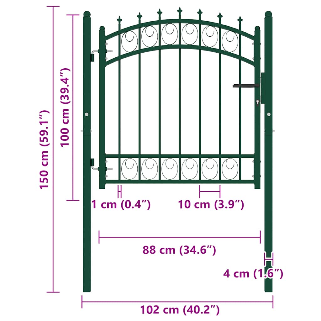 Lujatekoisesta teräksestä valmistetussa aitaportissa on tukeva rakenne ja sen jauhemaalattu pinta estää ruostumista ja korroosiota. Puutarhaportin pystysuorien piikkipäisten tankojen ja vaakasuorien vahvistavien tukien myötä, tämä portti tarjoaa korkealuokkaista turvallisuutta. Yläosan kaareva muotoilu lisää sen tyylikkyyttä. Sen mukana tulee kaksi kiinteää tolppaa ja lujat saranat helppoa asennusta varten. Toimituksessa mukana myös lukitusjärjestelmä kolmella avaimella.