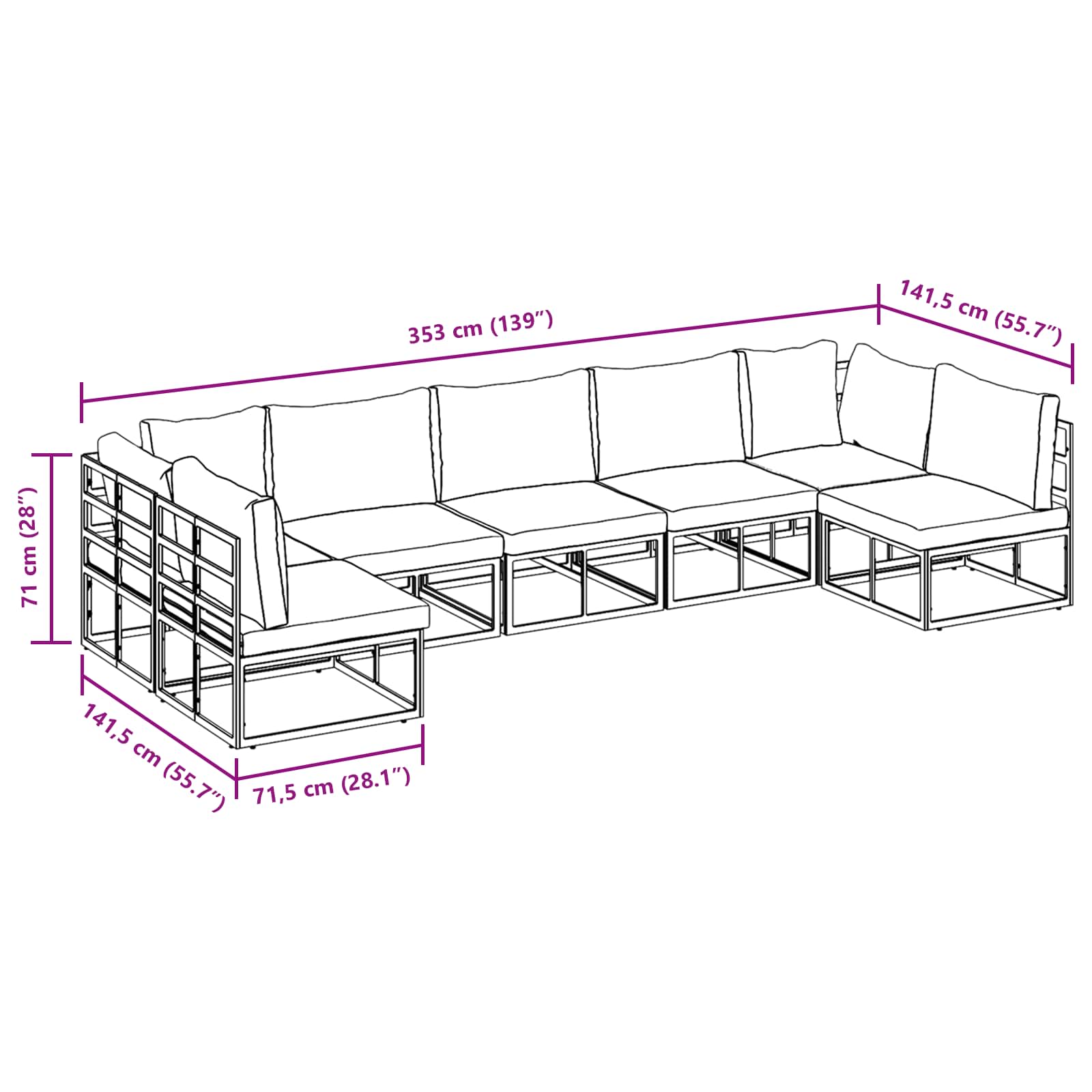 Puutarhasohva Setti 7 pcs Musta 353 x 141.5 x 71 cm Alumiini