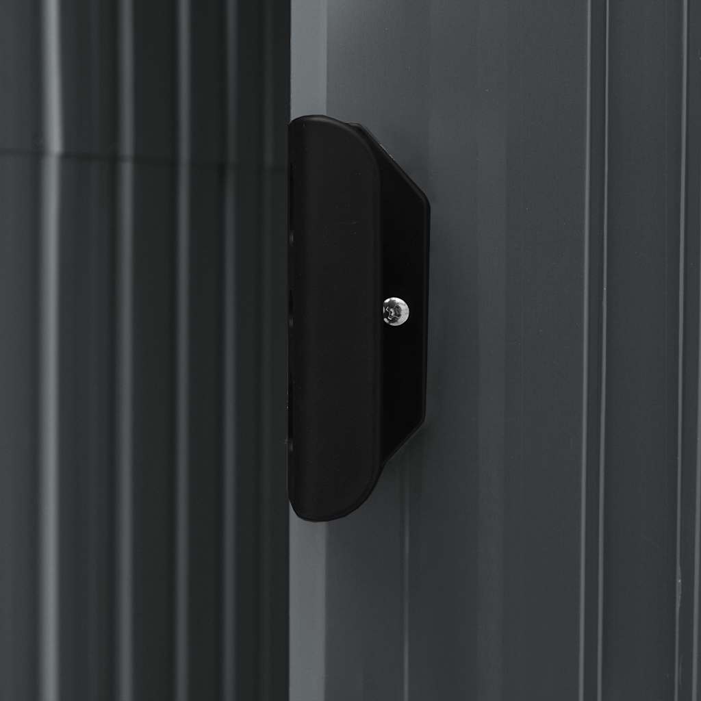 Varasto on rakennettu galvanoidusta raudasta, joten se on vakaa ja helppo ylläpitää. Puutarhavajassa on tuuletusaukkoja sekä edessä että takana, mikä varmistaa erinomaisen ilmanvaihdon. Yksinkertainen liukuovi, jossa on edessä muovinen kahva, mahdollistaa helpon sisäänpääsyn ja poistumisen.