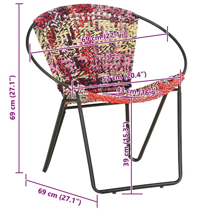 Käsinkudottu raidallinen puuvillaverhoilu on pehmeää koskettaa, kestävä jauhemaalattu teräsrunko tekee tuolista vakaan. Tärkeä huomio: Värit voivat vaihdella kappaleittain, mikä tekee jokaisesta tuolistamme ainutlaatuisen. Toimitus on myös satunnainen.