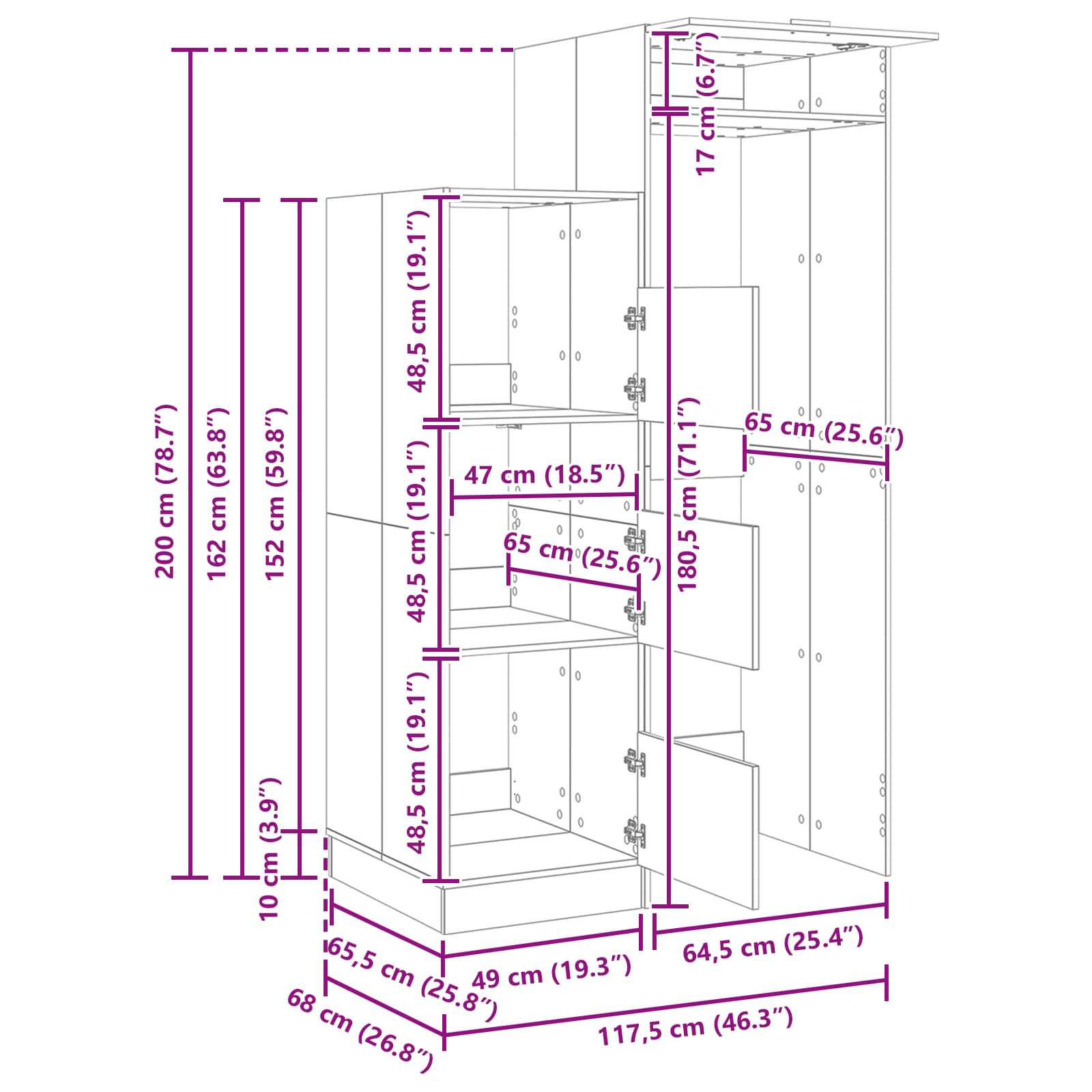 • Yleiset mitat: 117,5 x 68 x 200 cm (P x L x K)