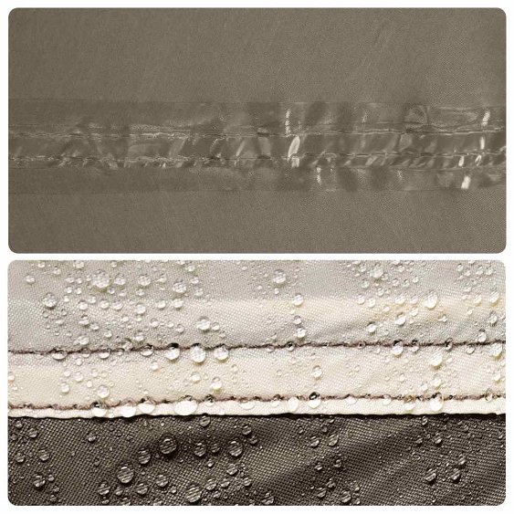 • Kestävä tafti-materiaali: Tämä suojapeite on valmistettu tafti-kankaasta PU-pinnoitteella, se on veden- ja tuulenpitävä. Lisäksi teipatut saumat estävät tehokkaasti sadeveden pääsyn, mikä auttaa säilyttämään kuivan ja mukavan sisätilan.