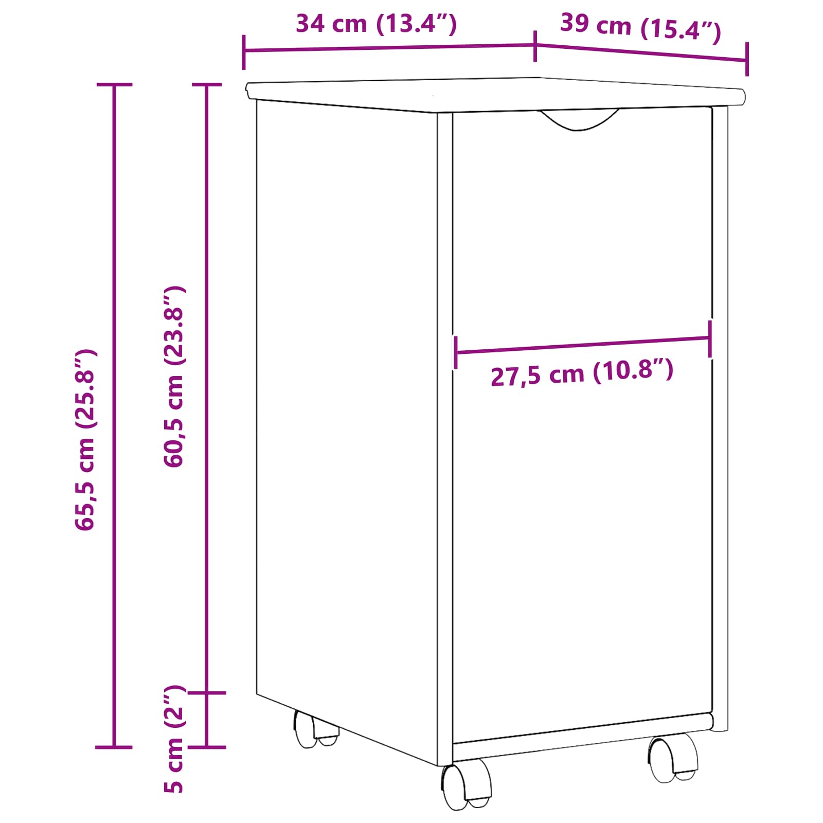 • 1 x Rolling cabinet: 34 x 39 x 60,5 cm (L x S x K)