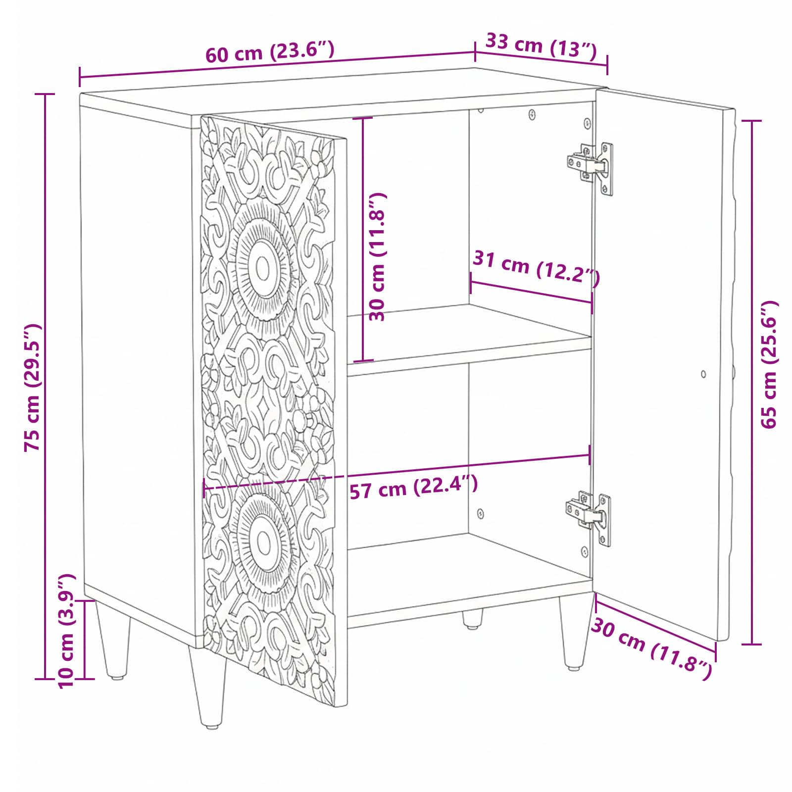 • Täysi Mangopuu: Tässä kaapissa on käytetty täyttä mangopuuta, joka on kestävä ja näyttää hyvältä. Luonnolliset puitteet varmistavat pidemmän käyttöiän päivittäisessä käytössä.
