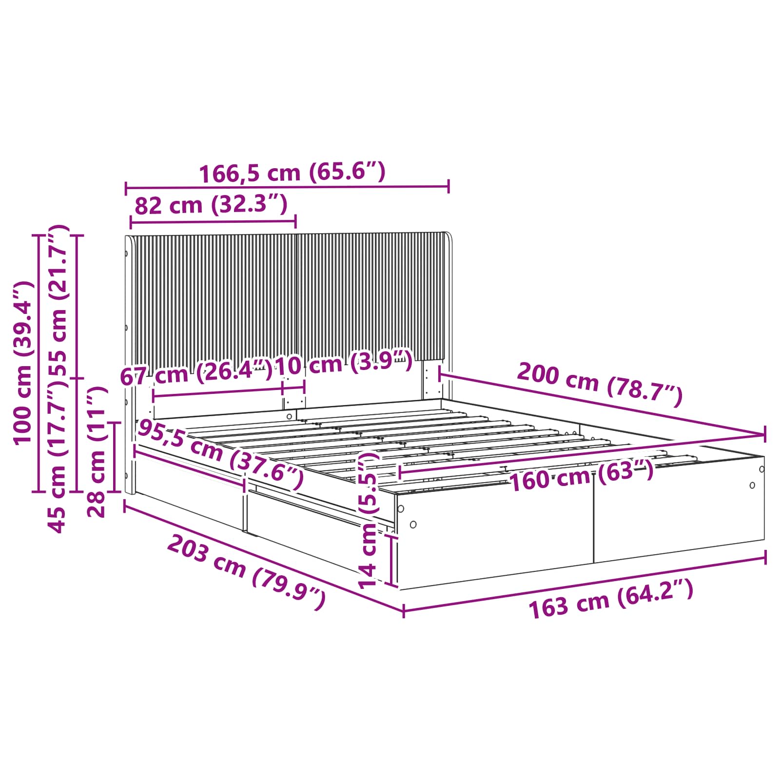 • Sängynpäädyn paneelin koko: 166,5 x 55 x 7 cm (L x k x s)