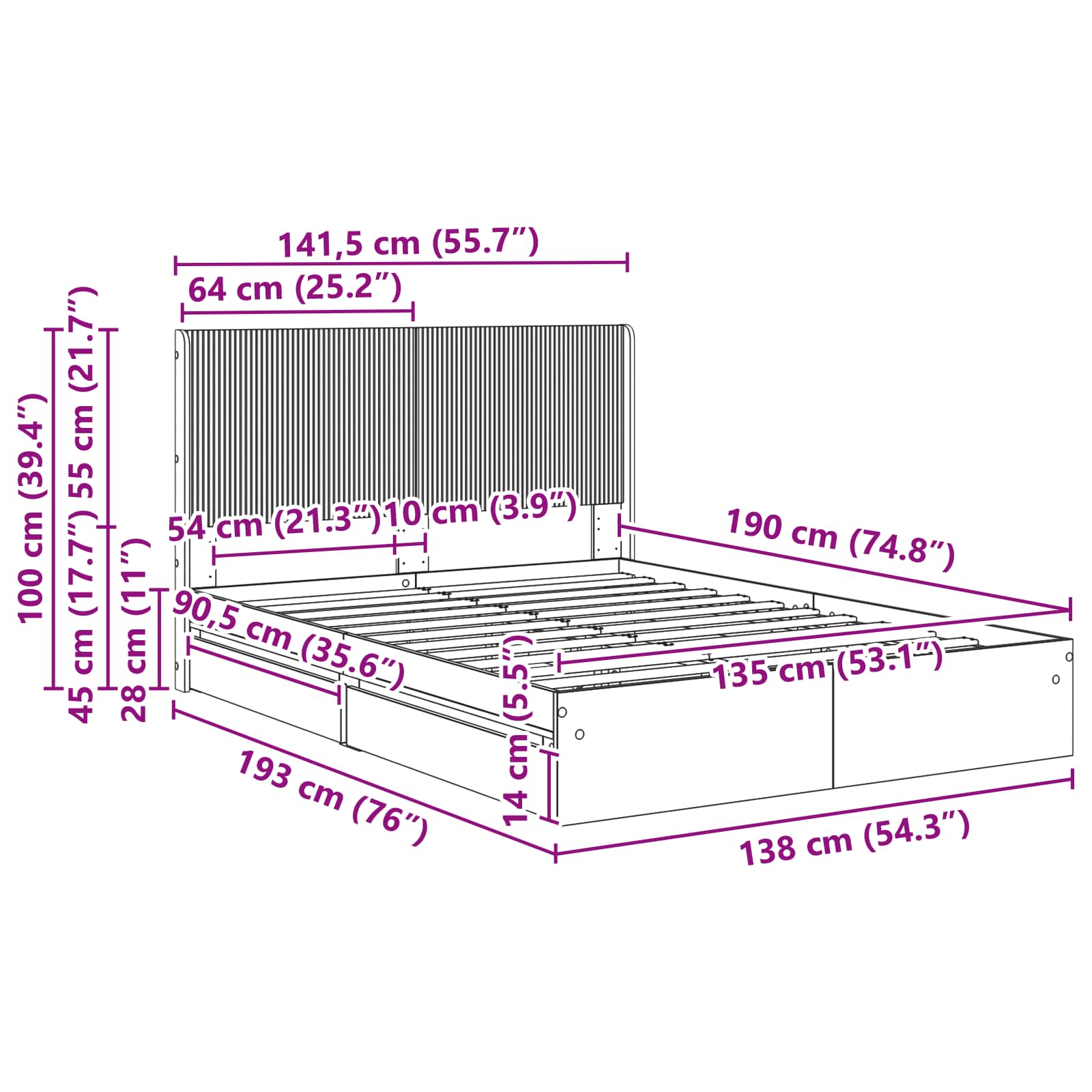 • Sängynpäädyn paneelin koko: 141,5 x 55 x 7 cm (L x k x s)