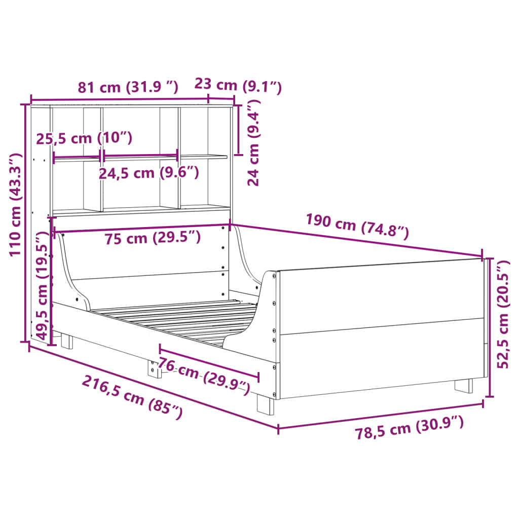 Sänky/kirjahylly ilman patjaa vahanruskea 75×190 cm täysi puu