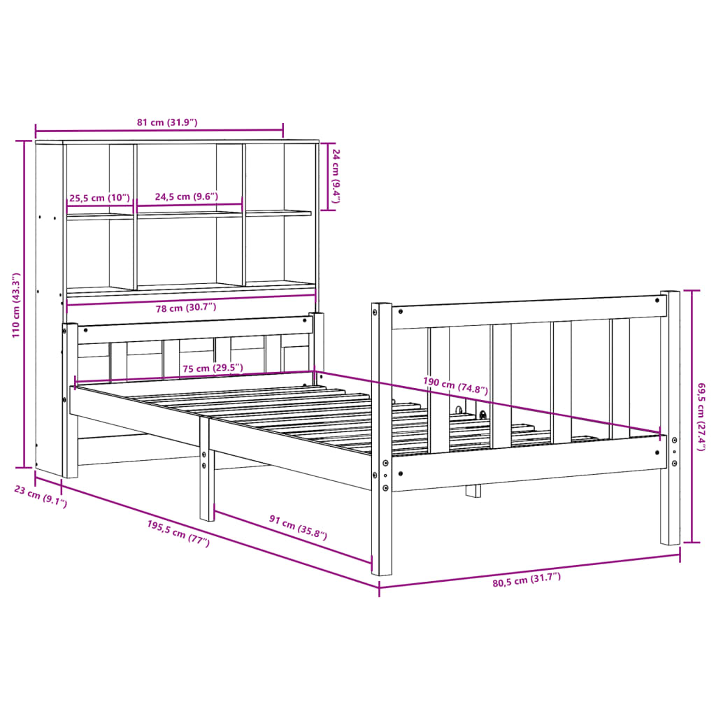 Sänky/kirjahylly ilman patjaa vahanruskea 75×190 cm täysi puu