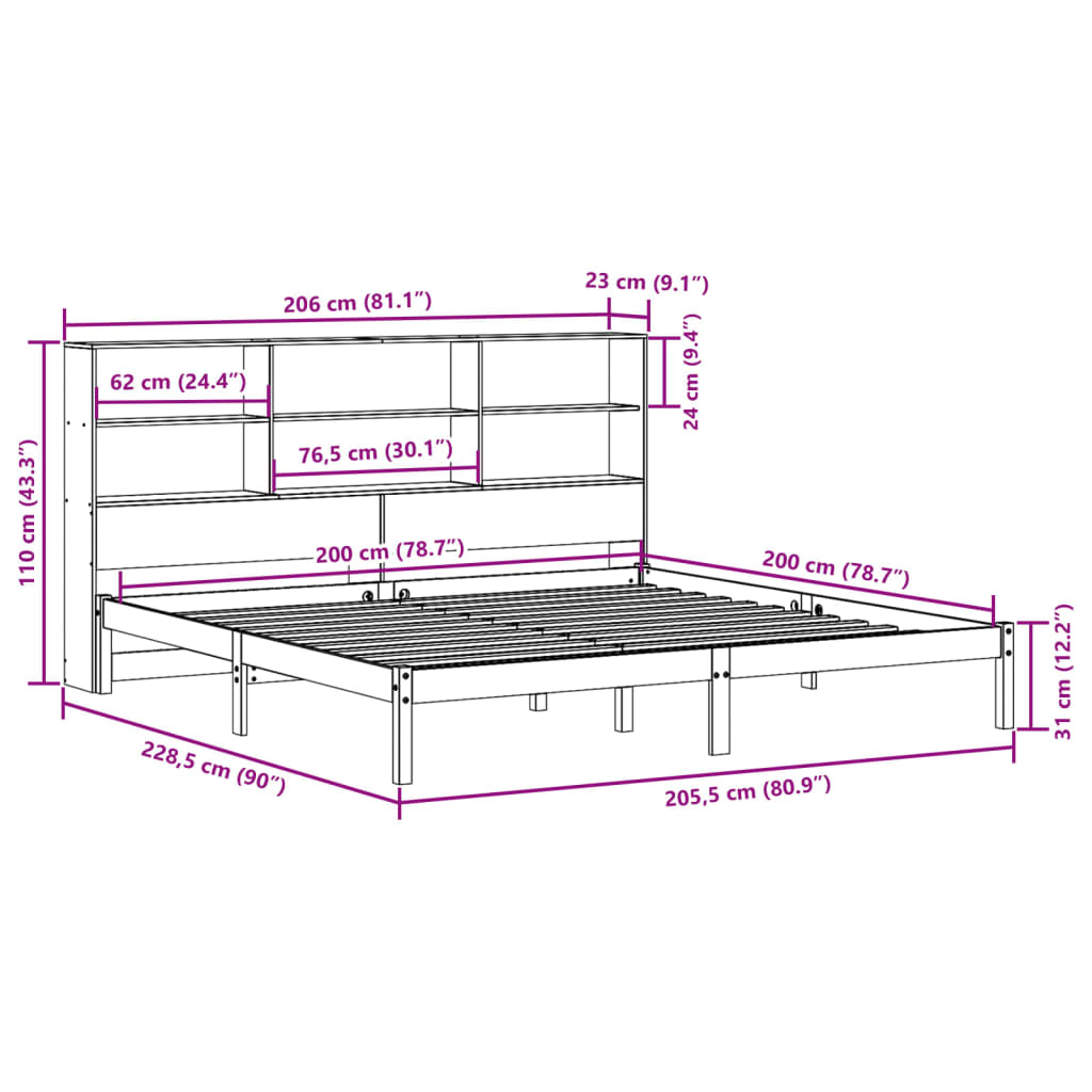 Sänky kirjahyllyllä ei patjaa vahanrusk. 200×200 cm täysi mänty
