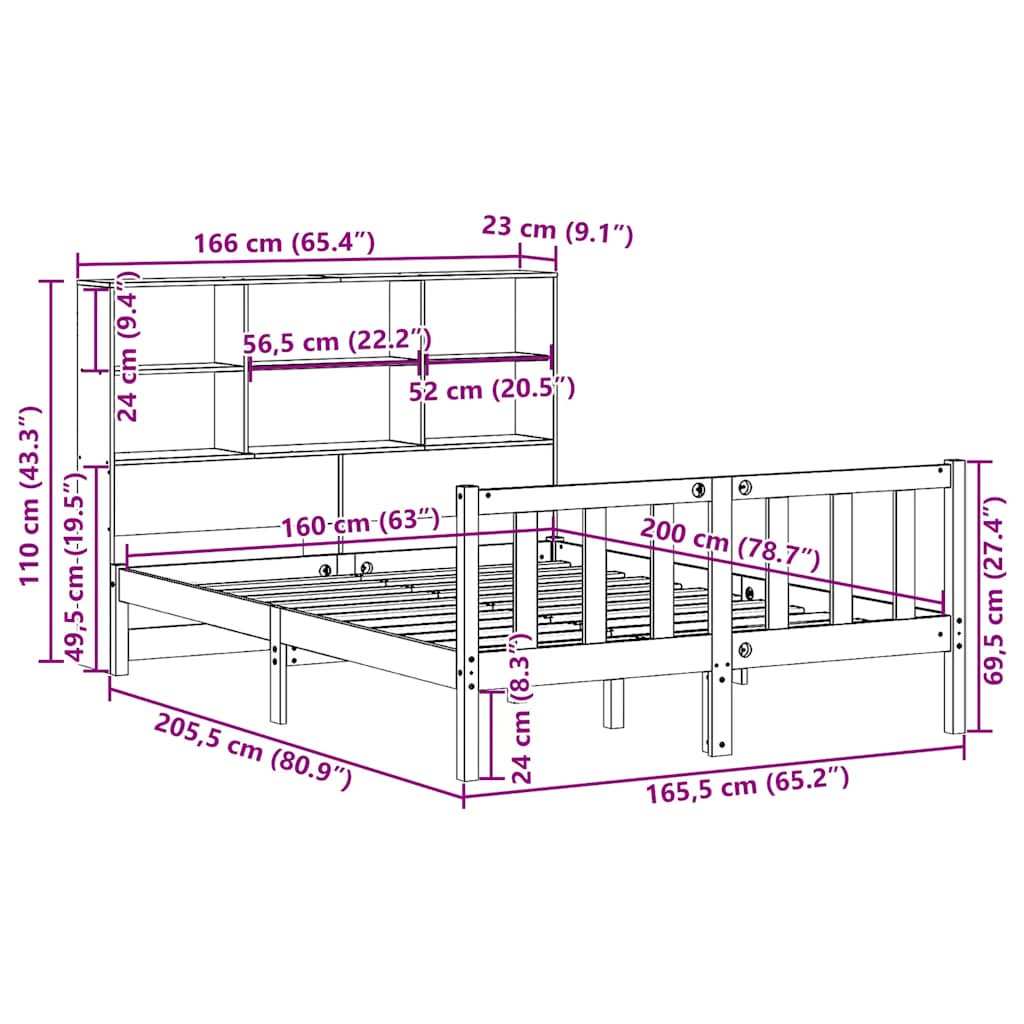 Sänky kirjahyllyllä ilman patjaa 160×200 cm täysi mänty